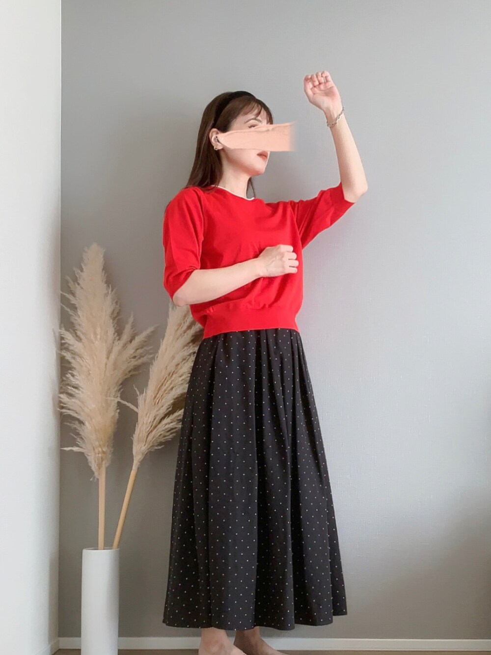 パッと目を引くカラーニットを主役に、バックウエストゴムで楽ちんなドットスカートを合わせました❤️🖤 やっぱり夏に1回は赤黒をやっとかないと❤️🖤 髪はカチューシャをつけてオシャレ見え🖤 ポーズは謎です笑