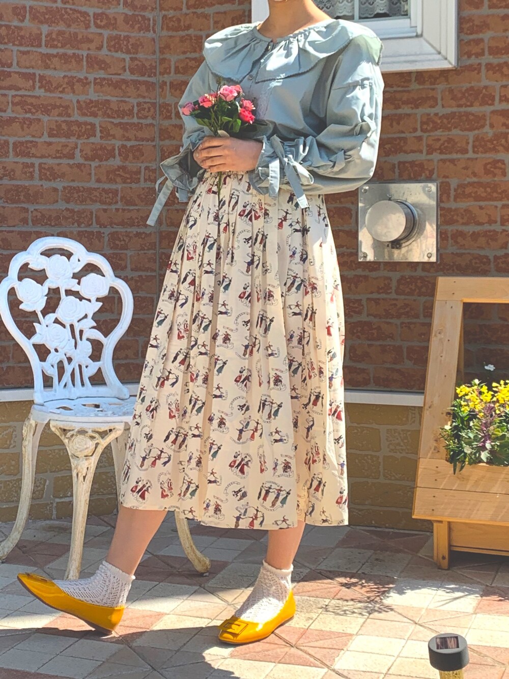 人気商品を使ったコーデ☕︎ パラビオンの踊り柄プリーツスカートとなっております⑅◡̈* ブラウスはお色の綺麗なミントグリーン、お袖のリボン編みがポイントです。 足元にも明るいお色を取り入れて、パラビオンらしい個性的なスタイリングに☾