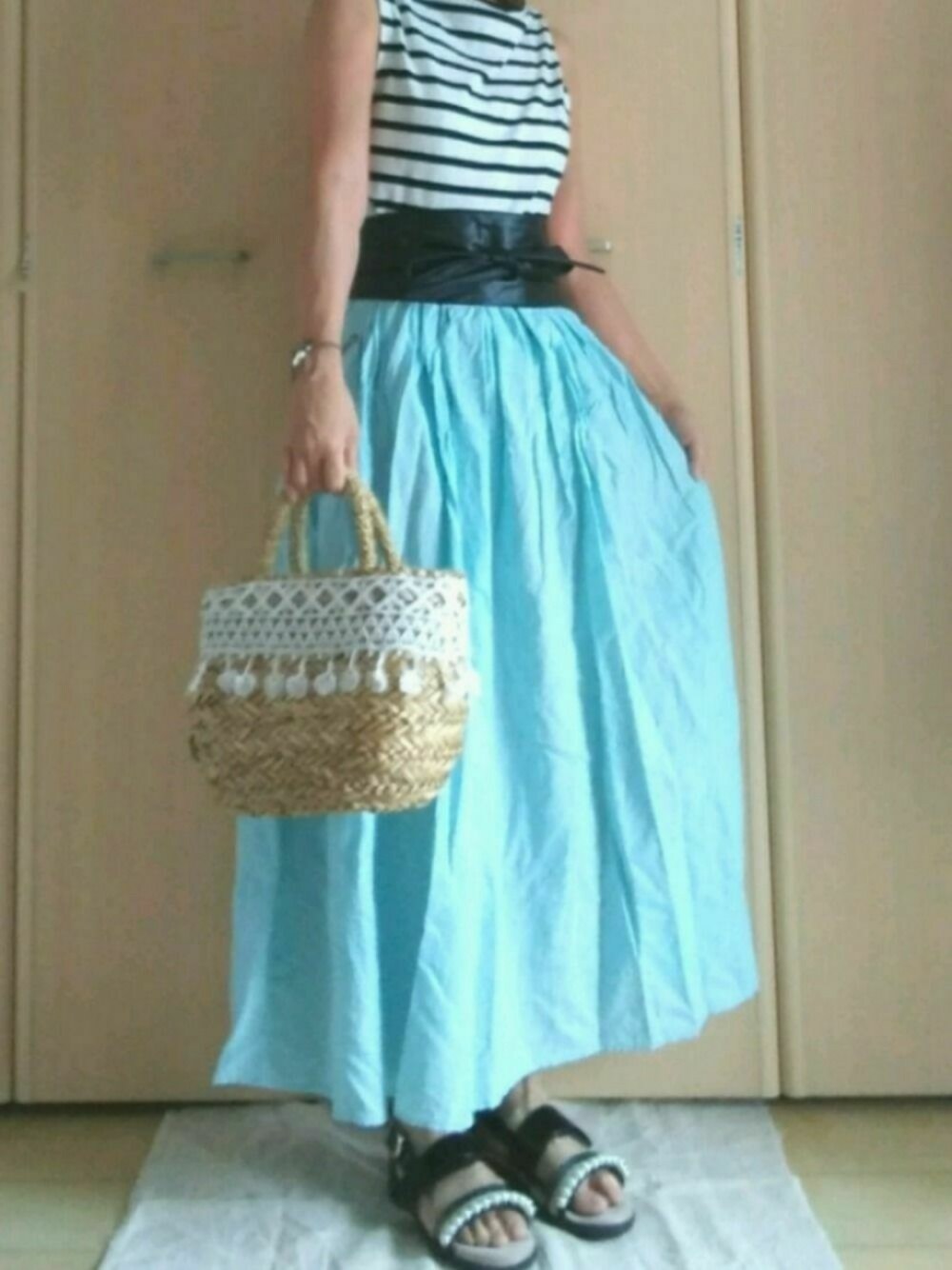 フェリシモのキレイ色コットンスカートに 夏らしくかごバック❤️ サンダルもフェリシモです。 いつもお世話になってます🎵 上下綿100%で、楽チン&肌に優しいコーデですよー。