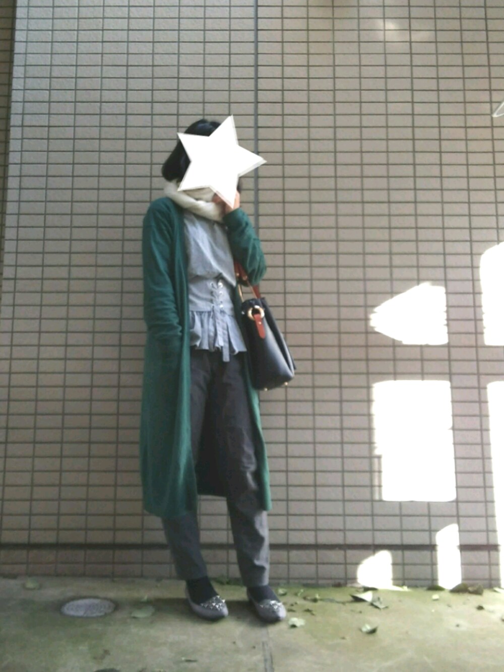 ご覧いただきありがとうございます。 寒くなってきましたね~⤵️⤵️ グレートーンでまとめたコーデにグリーンで縦ライン✨ カーディガン&パンツのインナータイツは綿100%です。