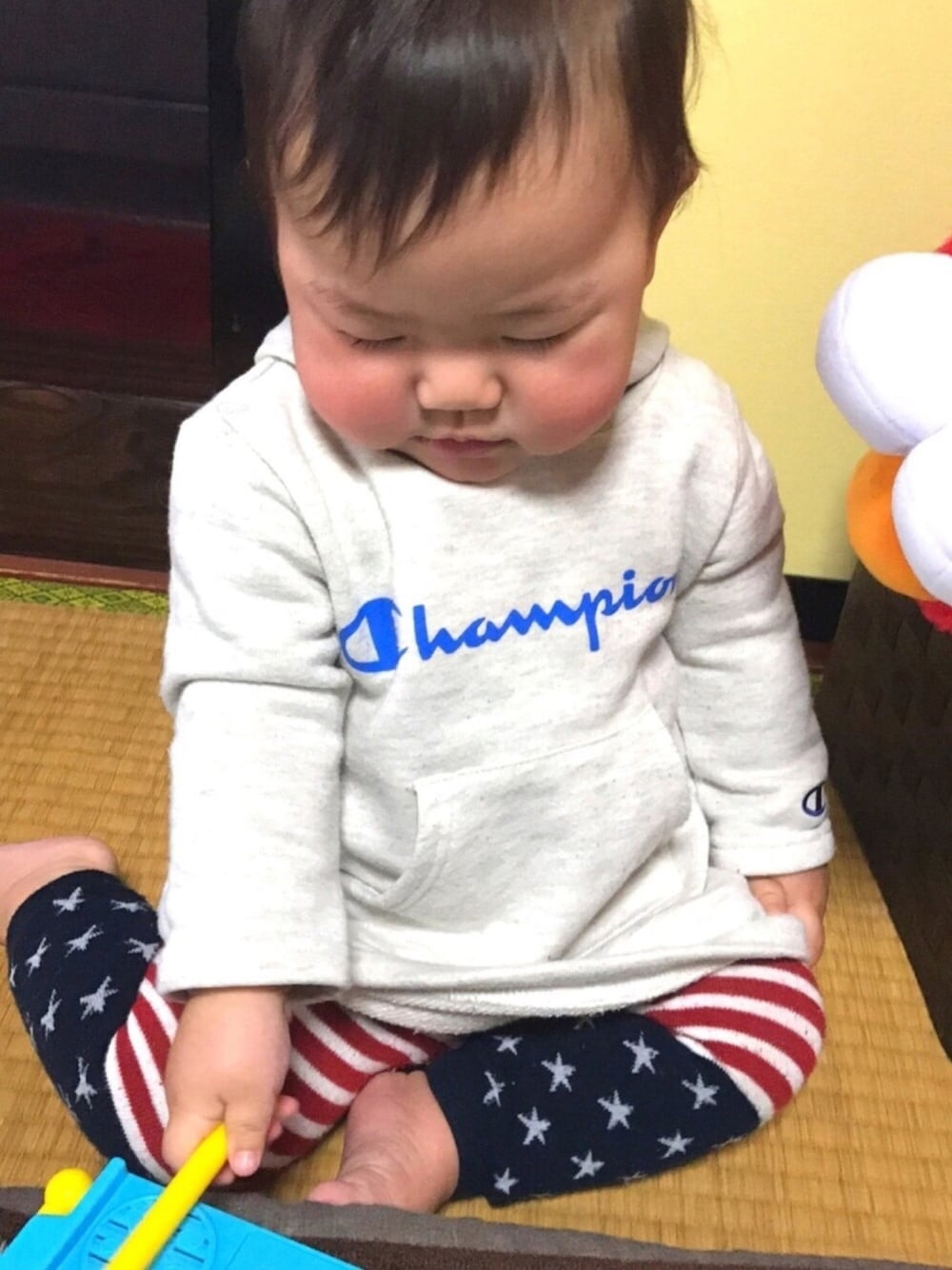 チャンピオンのワンピースは しまむらで買いました(人´_`)♡ 西松屋の国旗タイツは私のお気に入りで 使い回しまくってます笑