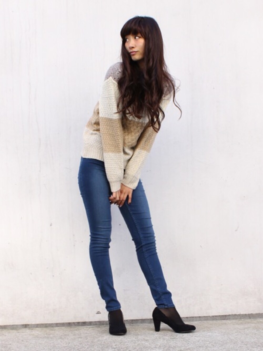 春らしいカラーリングが可愛いマルチボーダーニット♡ シンプルにスキニーパンツとスタイリング☆