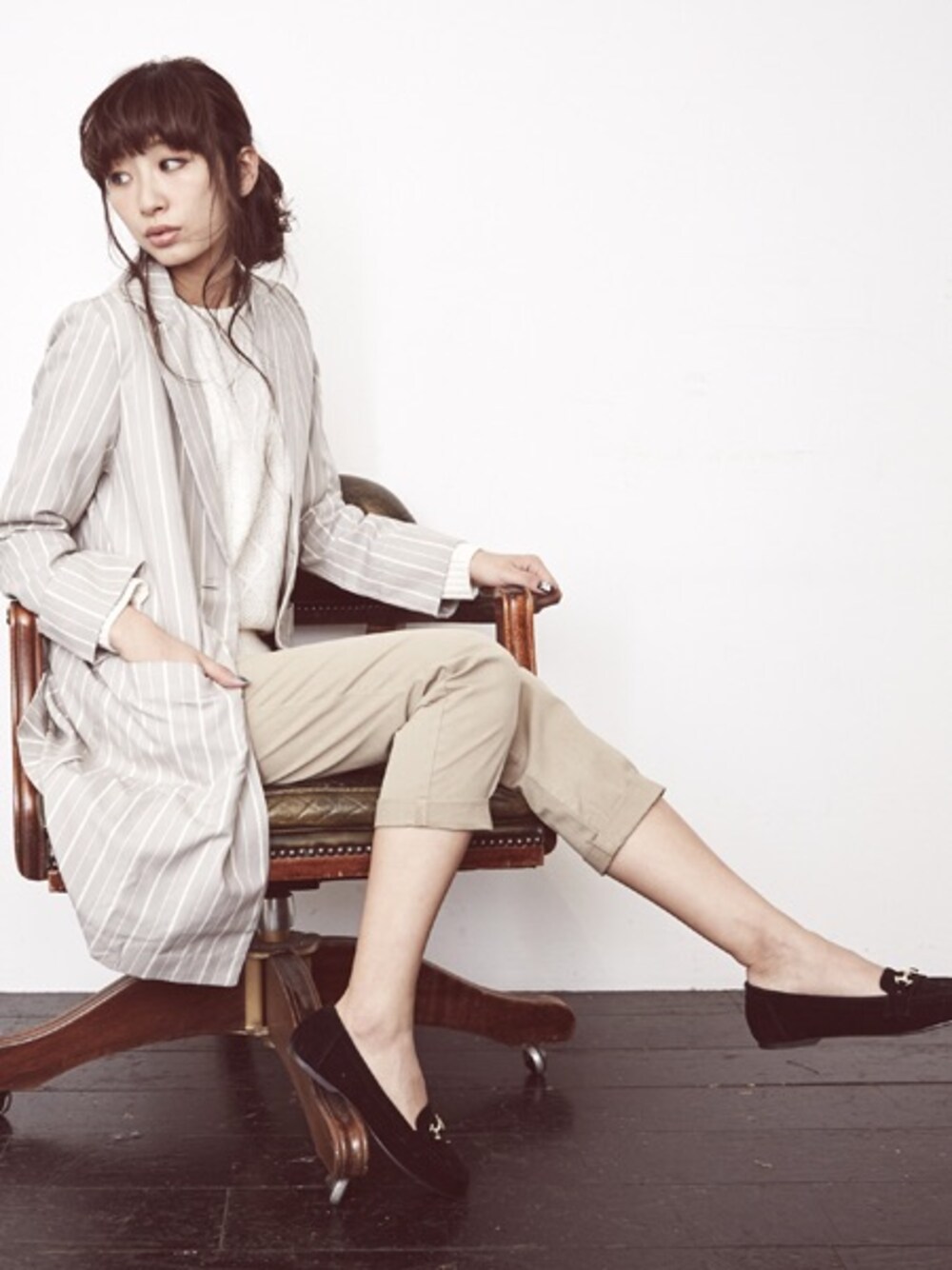 Parfum snapのチェスターコート「Parfum de Charmant Fleur/パルファムドゥシャルマンフルール/stripe chesterfield coat(ストライプチェスターコート)」を使ったコーディネート
