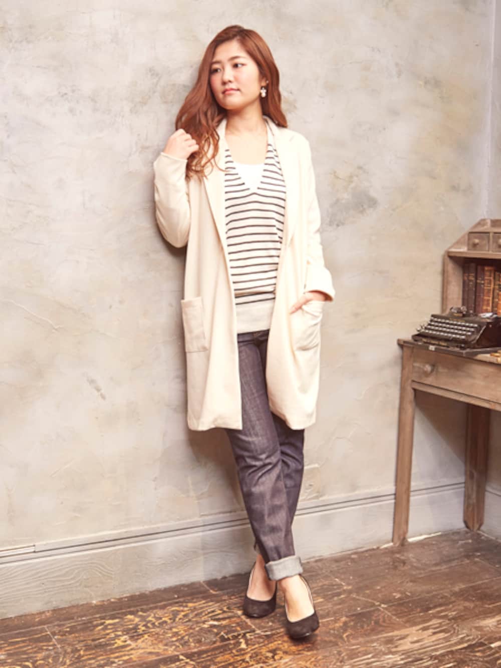 深めのVネックボーダーに、ポンチ素材が春らしい印象のカーデジャケットを羽織ってちょっぴり大人っぽいコーデにしました☆