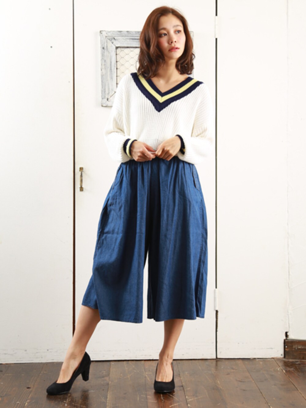 春らしい配色のチルデンとデニム地のガウチョを合わせた春のトレンドスタイルにしてみました☆