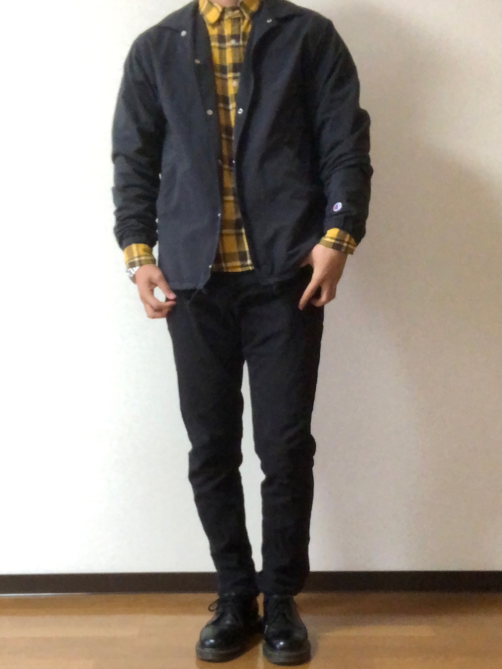 統一感のあるブラックコーデに 差し色で秋っぽい黄色のチェックシャツ コーチジャケットはチャンピオンと アーバンリサーチのコラボのもので 中が薄いボアで暖かいのが良い! パンツもスキニー気味やけど 少し緩めで、すごい履き心地良いし 生活しやすい。