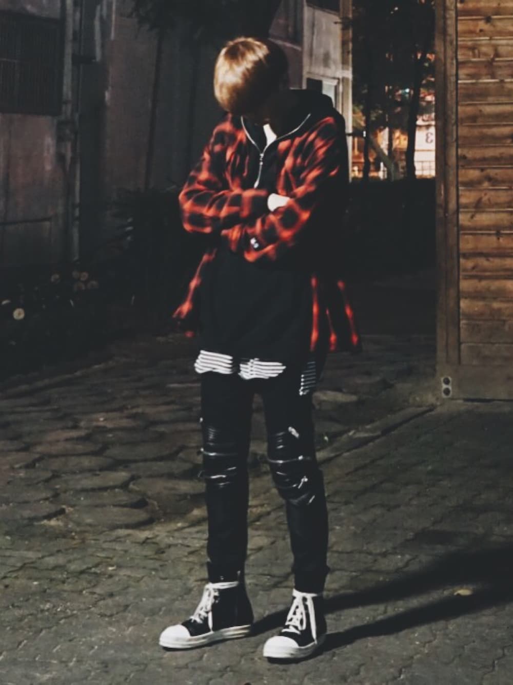 最近は 暑くなりました そして 韓国は今 黄砂 やばいですよね マスクしないと😷 道で 満開してる桜を見ると 去年、一種間 一人で 東京に行って みた桜が思い出して その時の道が 懐かしくなります コーデは 韓国の ソウルの 明洞で買った 한상혁デザイナーの HEICH ES HEICH の ロングチェックシャツ そして 最近 買った rick owensの ramones LPO スニーカーでコーデ してみました 全部気に入り^^ バイトしてる時 こんな格好なんですけど 足が痛いです