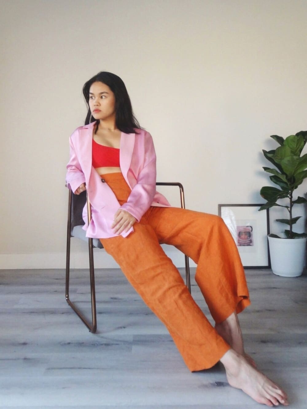 I call this my starburst outfit! Balance out an oversized blazer and wide legged trouser with a tiny top.