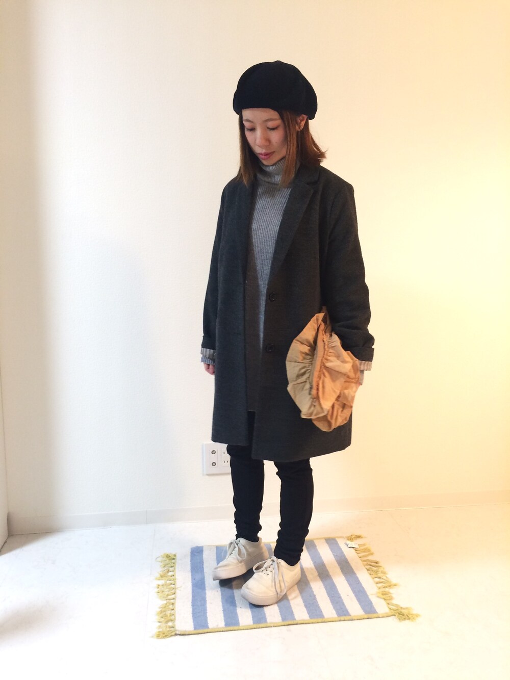 シンプル〜〜。 カスタネのノベルティのフリルポーチを クラッチバッグ風にしてみました。 ユニクロのレギパンは履きやすくてすきだ!