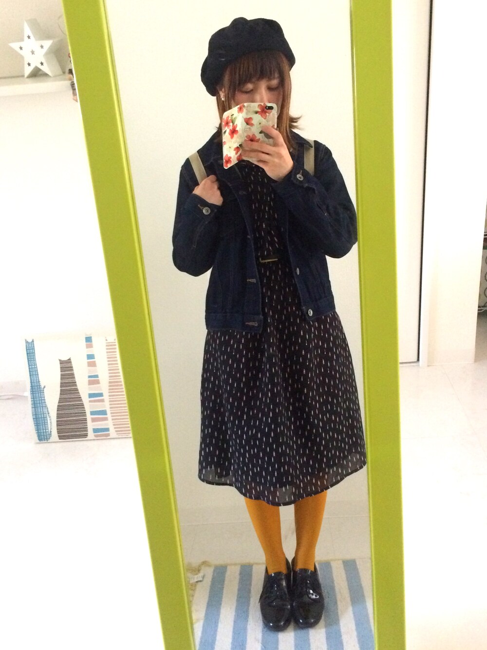 今日のポイントはマスタード色のタイツ!! あったかいから、やっとデニムジャケットが着れます! が、ちょっと子供っぽくなってしまったな。
