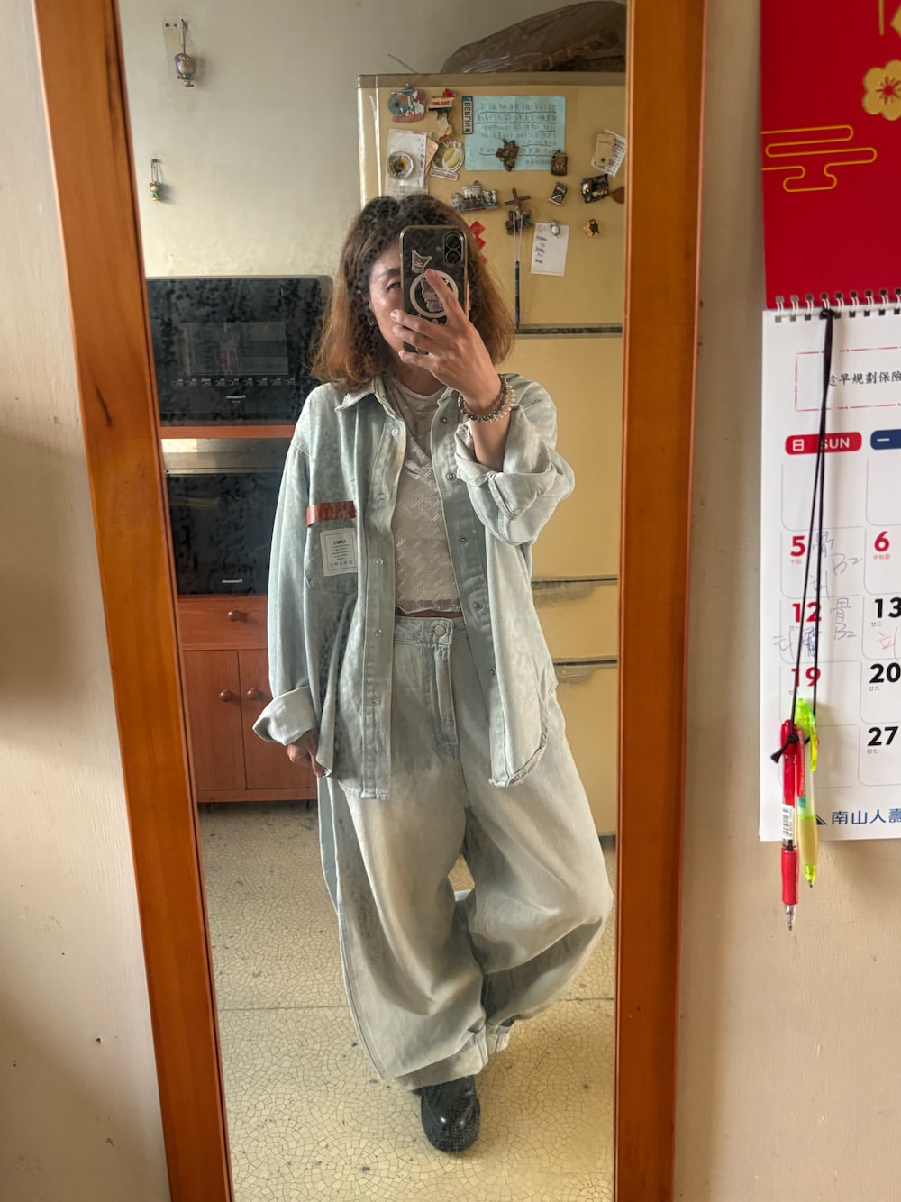 ブルー系のシャツ/ブラウス、ブルー系のデニムパンツ、ブラック系のブーツを着用したレディースの秋コーディネートの1枚目の写真