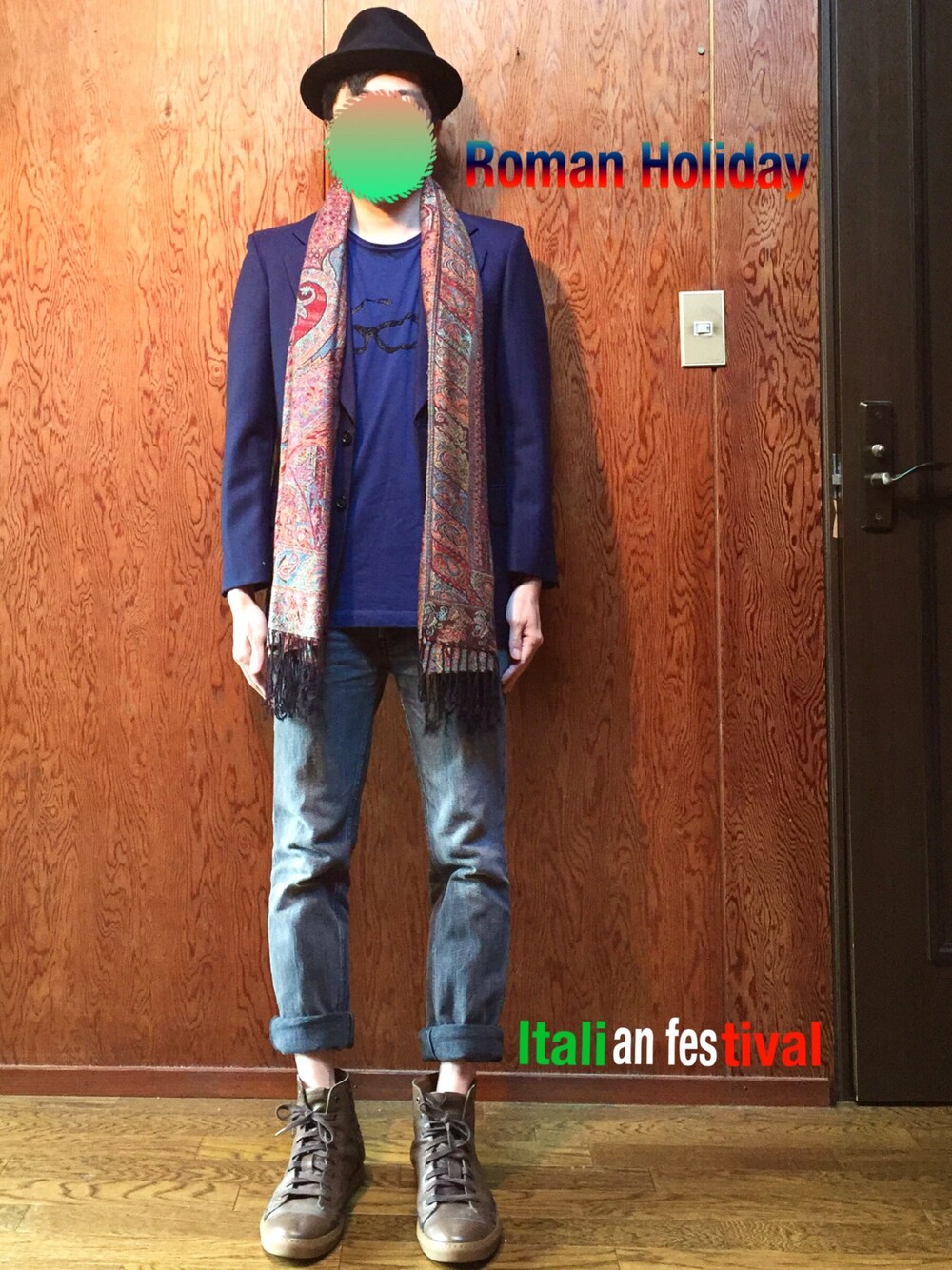 広い世界ぃ〜〜の 片隅に〜〜 (チャラ〜ラ〜ラ〜ラ〜) やがてふたりの朝が来る (チャラ〜ラ〜ラ〜ラ〜) あふれる光が (チャララララ〜) 頬の涙 をうつしだす (チャラ〜チャララララ〜) 尾崎紀世彦 ゴッドファーザー 愛のテーマより。 ゴッドファーザーのテーマに日本語歌詞があったなんて、初めてしりました(笑) と、いう事で今回のコーデはハロウィンど真ん中なので! ドン・コルレオーネのコスプレ! ではなく、Italian festival ITフェスに参戦致します(^^) 主催者失礼致しますね(≧∇≦) イタリアっぽい、トラッド(伝統的)なコーデ! いやはや、奥が深いテーマですね(^^) 私達はイタリアには行ったことはないので、色々とイタリアで思いつくものを挙げていきました(^^) 長靴、パスタ、ピザ、エスプレッソ、ムッソリーニ、ベスパ、ミラノコレクション、紅の豚、ジェローラモ、ジョルノ・ジョバーナ、誘拐大国、首相のセクハラ、、、、、などなど! でもやっぱり、 パッと思いつくのマフィアですね(≧∇≦) ゴッドファーザーの舞台のイメージというwww ということで、今回の師匠のコーデは! 「さすがにドン・コルレオーネのような立派なドンになれる気がしないから、海を渡ってパブリックエネミーぐらいにはなりたいコーデです。」 いやいや、パブリックエネミーはジョニーデップです、なんとおこがましいwww マフィアっぽさを出すためにハットを被りました(^^) ストライプのネイビーのテーラードに、インナーはあえてのTサツで、イタリア製V&Rの伊達眼鏡Tサツ。 そこにイタリアの隣の隣の国で買ったストールをマフィア掛けしました(^^) そこにデニムを履いてジェローラモ意識のちょい悪感をだしたそうですwwww スニーカーはイタリア製のマークジェイコブスです(^^) はい! ドン・コルレオーネどころか、パブリックエネミーのジョニーデップをも通り過ぎてチンピラ感が出ましたね(^^) せめてもの救いが、マフィア掛けしたストールから、インドのカリスマミュージシャン shigh is kinng感がほのかに伝わった事です(^^) えっshigh is kinngを知らない!? あのカリスマを!?youtubeへGo!! イタリアじゃねーだろ!? ですって? Italian festival! 略してITフェス! IT大国って!インドですよね!!! おっと失礼しました囧rz それでは、この辺で! アリーヴェデルチ! (さよならだ!) ジョジョの奇妙な冒険 第5部 黄金の風 より