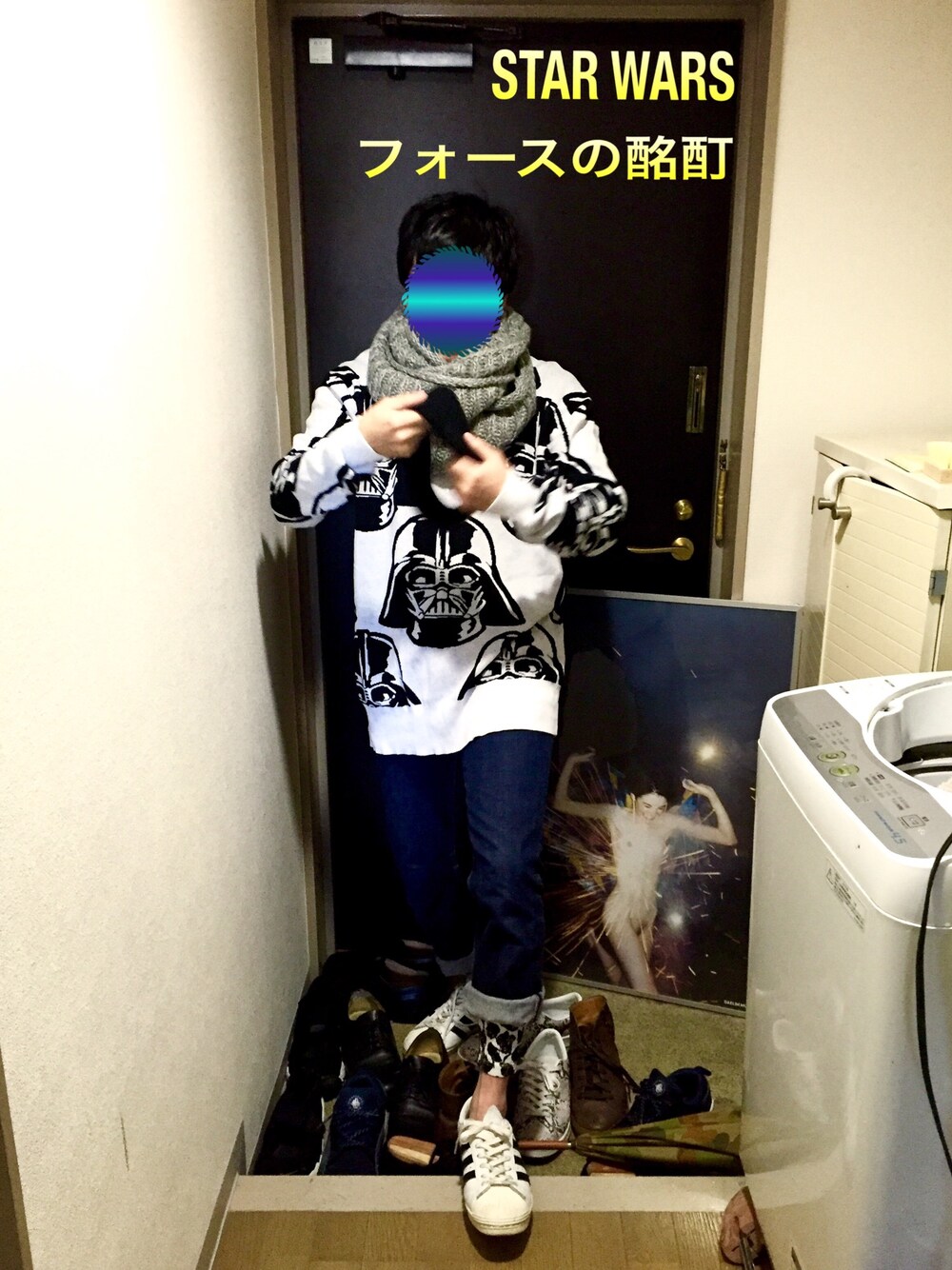 3軒目 ぐでんぐでんになり、圧倒的な濃いキャラのWEARの愉快な皆様に押されまくった忘年会から一夜あけ(≧∇≦) 朝からチビリチビリとぬるいビールをやる師匠と大頭脳氏(^^) しかし、この日は夕方まではインターバルという事で!!(≧∇≦) お待ちかねの!!!!! やっとこさ!!!!!! 見に行きましたよ!!!! スターウォーズ!!!! エピソード7!!!! フォースの覚醒!!!! 師匠も大頭脳氏も自称、 「根っからのスターウォーズファン」 と言ってはお互いの知識をひけらかしては牽制しあってますww その割に色々うろ憶えなのはツッコミませんが(笑) インターバルというのも、師匠も大頭脳氏も寄る年波には勝てずド頻尿という事で上映中アルコール控えました(≧∇≦) さてさて!!スターウォーズですが!! 今回は大頭脳氏の手配で3Dでピカデリーにて。 感想は色々言いたいのですが!! まだネタバレはご法度故、簡潔に(^^) かなりディズニー寄りになったなぁと。映像美や往年のファンを唸らせる演出は見事!! しかし物語がどんどんシンプルになって勧善懲悪感は否めない囧rz 話が分かりやす過ぎる。 登場人物がまだ少なめなのも三部作の一作目のご愛嬌かなと(^^) ただただ次作が楽しみで仕方ないですが!!! 鑑賞後、映画館から出た師匠はご機嫌斜めでした囧rz 理由は ・視力が落ちすぎて字幕がピンボケで目で追うのが必死だったこと。 ・大頭脳氏がいいシーンになったらテンションが上がり師匠を目隠ししてきたこと。 2人は劇場内でぽこぽこ、やりあってました(笑) やっぱり酔っ払いな2人囧rz その後、立ち飲み屋に移動しスターウォーズ談義を開始。 大頭脳氏が、本作のルークスカイウォーカーと師匠がキャラ被りまくってる!!と、言い続けた事により師匠は機嫌が直りしたが、、、、、、 でもそれって、、、、、、、!!! おっと!これ以上は、、、、囧rz 今回の師匠のコーデは! 無論スターウォーズ見に行くコーデです(≧∇≦) 慌てて買ったダースベイダー柄のニットに、忘年会のプレゼント交換でいただいた暖かスヌード(^^) デニムにストームトルーパーっぽい柄のレギンスをレイヤード(≧∇≦) 大頭脳氏からカリパクしようとしたadidasのスーパースターです(^^) しかし、このコーデは首回り以外クソ寒い事が発覚。 次作の公開の季節が秋か春先と言うことを信じて、とっとと着替えてこのコーデでは観に行かなかったとか、行ったとか(≧∇≦) それはまた別のお話(≧∇≦) そして私達の酔いどれ珍道中はいよいよ最終局面に、、、、、、、、、、、