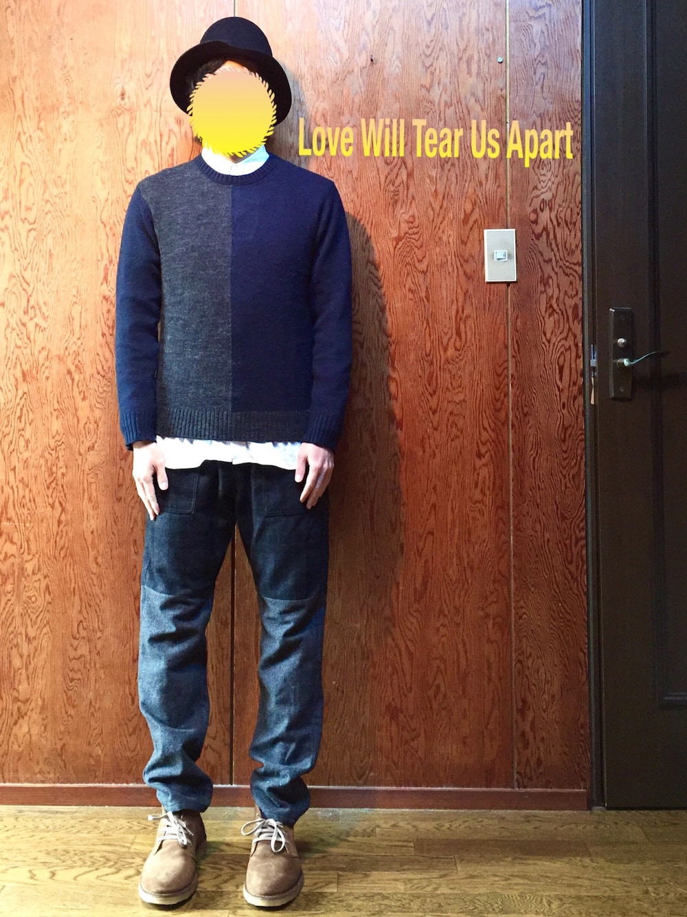 Love Will Tear Us Apart 〜愛が2人を引き裂いた〜 イギリスのバンドJoyDivision。 その代表曲のタイトルであり、 そのバンドのボーカルで今は亡きイアンの墓標に刻まれし言葉。 暖冬ですね(^^;; もう晴れた日は小春日和と言っていいほど。 春を感じることは、新しい生命の息吹を感じ、まだ見ぬ素敵な出会いに思いをはせることができますね(^^) しかし同時に春は別れの季節ですよね。それぞれの道に踏み出す誰かを見送りながらも、自分も新しい道への第一歩を踏み出すという喜びの中の切なさ、、、 しかし別れる事、別々なことが全て悲しく切ない事ではありません。 メダカと金魚は一緒の水槽に入れていけない。 →金魚がメダカを食べる可能性。 トイレとお風呂は別々なほうがいい。 →お部屋探しの必須条件。 酢豚のパイナップル問題。 →一緒だと中々白飯が進まない。 ウルトラマンと仮面ライダー。 →どれも一緒じゃないもん!1人1人にドラマがあるもん!特徴があるもん! 誰だ!?魚肉ソーセージとバッタって言ったのは!? 2色別れたバイカラーニット →師匠最近絶賛どハマり中。 と、いう事で今回の師匠はバイカラーニットがメインのコーデです(^^) えっ! それがやりたいがために、思わせぶりな文章をチンタラ書いたのか? ですって!? いやいや、、、、、、 えっ! まさか「バイカラー」のタグ使いだけじゃないだろーな!! ですって!? いやいや、、、、、、 さてさて師匠のコーデはバイカラーニットがメインです(^^) 最近バイカラーニットにハマったのか同じようようなニットをよく着ている師匠。 今回は無地のグレーとネイビーのバイカラーニットをシャツと合わせました(^^) そこにバイカラーのパンツを合わせる、バイカラー押しコーデです(O_O) ハットは師匠絶賛どハマり中のaquviiの人面マウンテンハット。 靴はアローズのチャッカブーツです。 あれ、2.3コーデ前と結構似て、、、、 ゴホンっ!!!!!! 別!別!ですwwww 師匠は今宵ジョイデビジョンを流しながら芋焼酎をかっくらいヨダレまみれでお腹をだし、エアコン、パソコン、テレビ、照明、こたつ全てをつけっぱなしで爆睡しています囧rz お金と健康と別れる前に、少しだけでいいのでアルコールと別れていただきたいものです(T_T) 追伸:以下、師匠の個人宛の伝言。 大頭脳様、大頭脳様。 グラストンベリー行き、了解しました。 チケットとりましょう! 死がこの世と私を別つまでお供します! 英国紳士どもに侍の恐怖を見せつけてやろう。 ともに狂い死にしましょうぞ!!!!