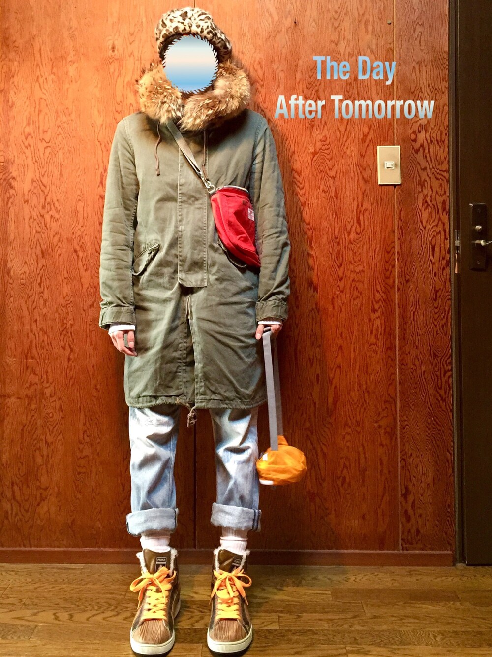 時は、西暦20XX年。 地球温暖化の影響により、南極大陸の氷が溶け、海流変化し異常気象がうんたらかんたら、、、、、、 世界は氷河期を迎え、 人類の文明は終わりを告げた。 生き残った人類は、 廃墟の街でわずかながらの燃料と食料で細々と猛吹雪に耐え生きながらえていたーーーーーーーー 師匠 「かれこれ2週間か、この吹雪はいつ止むのだろうか。食料と燃料は後どれくらいある?」 私 「先々週捕まえたトナカイの干し肉で後2.3日ってところですかね。それよりも燃料が今焚いてるこれでラストです。」 師匠 「まずいな吹雪が明日止まないと、凍死だな。」 私 「でも最悪これがあります。これを燃料にすれば1日はもちます。」 師匠 「おっ!これは12年もののスコッチじゃないか!最早文化遺産だよ、これは。 これを燃料に、、、、、いやっ!もったいない、飲もう。」 私 「言うと思いましたよ。賭けですね。」 師匠 「奇跡すら凍っちまう世界で、飲兵衛最後の悪あがきと洒落込もうや。吹雪が勝つか俺達の悪運が勝つか、、、、、」 私 「のりますよ、どうせ吹雪がやまなけりゃ凍え死ぬ運命ですから」 師匠「乾杯」私「乾杯」 ・・・・・・・・・・・・・・・・・・ 朝が来たーーーーー あれ程に荒れ狂っていた吹雪やみ、 外が明るい。 私達は勝ったのだ。 私 「生き残りましたね。師匠。これからどうします??」 師匠 「あぁ、南南東5km先にショッピングセンターがある、まずは食料を調達だ。」 私 「うまい酒は残ってますかね?」 師匠 「おまえさんも飲兵衛だな。その後は南に向かおう。生き残った人達のコロニーがあるかもしれん。」 私 「ですね、、、あっ!師匠!あれ!」 そこにはトナカイの群れ。 吹雪の終わりを待ってましたと言わんばかりに南へと進軍を始めていた。 師匠 「私達も出発だ!!」 私 「はい!」 歩き出す私達の背中を、雲の隙間を縫った太陽の光が照らす。 これは私達、いや人類、いや世界を蘇らせる希望の道標になるのか、 それとも、、、、、、、!!! いやはや暖冬、暖冬言ってた年越しが嘘の様に!!!! 来ましたね、寒波!!! 朝起きて外を見ると、どっさりと雪が積もっているわけで、、、、、 車に積もった雪の量見て戦意を喪失した私達は大至急コタツに避難し、厨二病全開の妄想にふけっているわけで、、、、 寒波に完敗したコタツ内勇者の師匠の今回のコーデは、 寒波になんか負けないぞ!氷河期サバイバルコーデです(^^) メインはモッズコートです、インナーもバッチリでファーもしっかりしていてかなりあったかいです(^^) そこにはヒョウ柄ベレー帽。 アンゴラ素材で温めで、いざとなれば耳も隠せます(^^) 文明崩壊後に潰れた動物園から逃げ出したヒョウに対しカモフラージュにもなります(O_O) 文明崩壊前は二子玉川のオサレ主婦の必需品のバッグンナウンポシェットは、発煙筒、干し肉、ナイフ、拳銃、スニッカーズを入れるのに持ってこいです(^^) 食料を見つけた時用の折りたたみデイパックはドイナーで、安定の使い勝手の良さで7.5L(^^) ヒートテック重ねばきを優しく包むデニム転写コットンパンツは速乾性に優れ、見かけより実用的です(^^) それをロールアップし、何重にも白ソックスを重ねばきしヒートテックと連結。 師匠曰くこれがめっちゃ暖かいそうな(^^;; スニーカーは木目柄、鹿グラフィックのPUMAのボアスニーカーです。 さぁ!これで!!!!! 寒波に負けず!!!外へ旅立ち!!! と、言うわけにはいかずwwww 玄関数歩先で雪だるまを作っただけで、腰をやられ、コタツの中で下町のナポレオンをちびちびと、、、、、、、、 妄想と現実がかくも開きすぎると悲しいものですね~_~; 早く春よ、来てほしい!!
