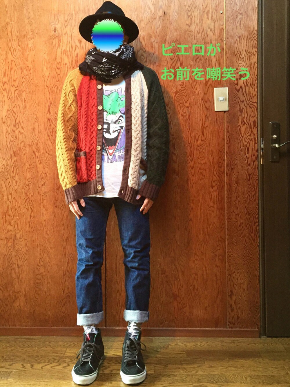 狂っているのはどっちだ? 俺か? 世界か? 〜マッドマックス 怒りのデスロード〜 より。 はい、私達。 狂いそうです、、、、、、、、、 連日TSUTAYAを2店舗往復し、 狂ったように手当たり次第借りまくりました囧rz あまりにも無計画なために明日中に6本をクリアしなければいけない状況陥ってます。 とりあえずマッドマックスだけ3回みときました(O_O) レンタルしてきた映画の中でも1番期待している作品は 「ピエロがお前を嘲笑う」 という映画です。 天才ハッカーが過激なハッカー集団に加担し、徐々に危険な世界にどっぷり浸かり狂っていくというストーリーです。 予告編では誰も予想できない衝撃のラストがあるとかないとか、、、、、、、 この作品を鑑賞のトリにと考え、ひたすら映画を消費してやろうと思います。 と、ここまで書いて、、、、、 えっ!?引きこもりのTSUTAYA事情なんて興味ねーよ! ですって!?(O_O) 服の話しろよ、このう◯こ野郎! ですって!?(O_O) わかりました囧rz 今回の師匠のコーデは、 「師匠がお前を嘲笑う」コーデです(^^;; 師匠、アイコンの裏側で皆さんを嘲笑ってますよーーー(≧∇≦) おーおー、よくこんな偏屈で歪んだコーデを見よるわとwwww でも心優しいWEAR民の皆さんはきっと、引きこもりニート野郎に嘲笑われるぐらいじゃ、優しさを忘れないと信じてます囧rz つば広のマウンテンハットに、 メインはピエロの衣装の様なクレイジーパターンのケーブルニットカーディガンです(^^) ゴツめのケーブルニットでパーツごとに色が変えてあり凝ったデザインです(^^) もうかなり暖かいので、重ね着したTシャツでインナーは充分ですね(^^) インナーのTシャツは勿論❗️ キング・オブ・嘲笑いリスタの ジョーカー先生の90年代のTシャツです(^^) パンツはシャマのデニム。 靴下は 「ぴょんぴょん、ぐるぐる、ぶくぶく柄」 という、完全に消費者を嘲笑っているとしか思えない名前の柄の靴下です(^^) スニーカーは師匠狂っていることから、 大麻柄のVANSです。 スニーカーの柄ではいいけど、 本物はダメ!ゼッタイ!! はい、笑顔の中にも狂気を感じるようなコーデになりましたね(^^) さてさてマッドマックス4回目の上映に戻りますかね(≧∇≦) 他作品に手がつかない件囧rz このペースだと延滞は必至!!! What a lovely day!!!!!! 派手に飛び散るぜ!!!!! お小遣いが、、、、、