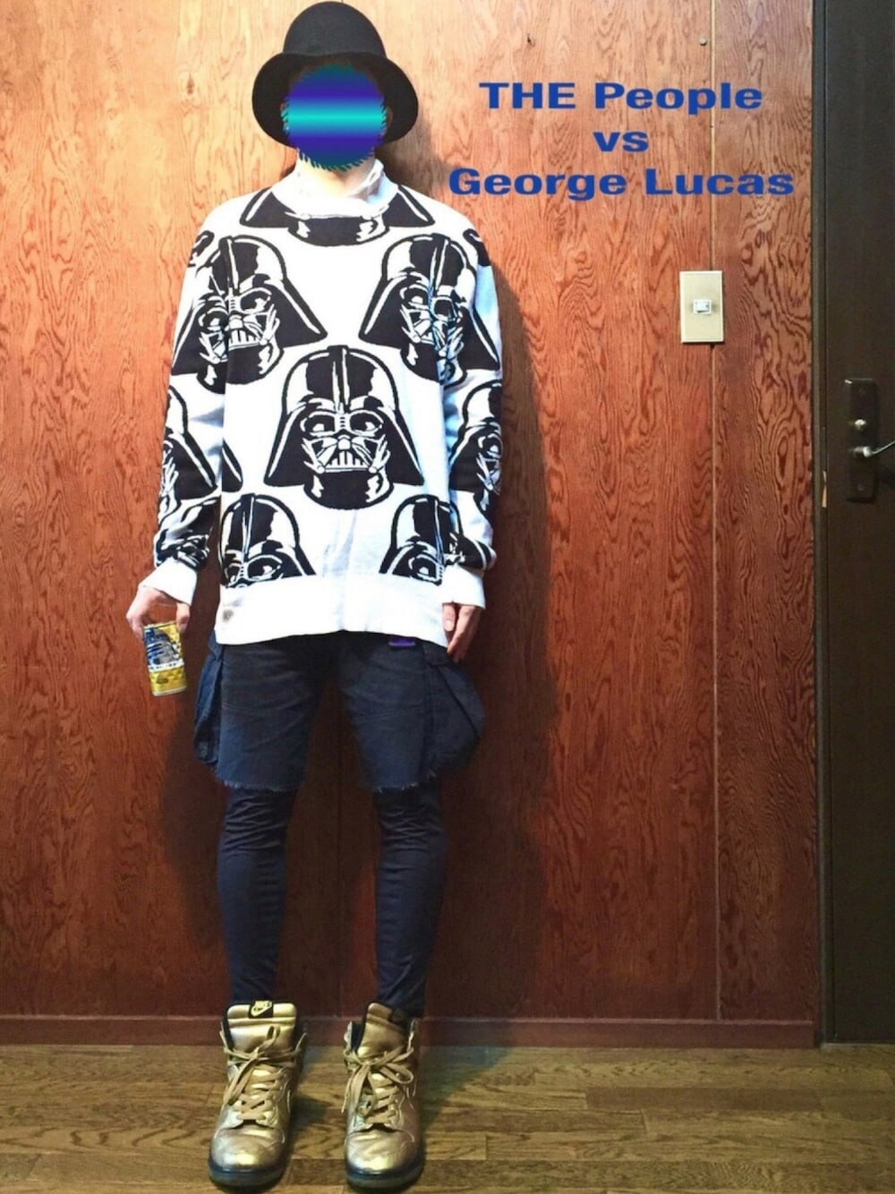「20世紀FOXのロゴが出るタイミングが20コマ遅い」 「完全な失敗だよ。駄作だ」 「エピソード1、2、3は俺の中では存在しない」 「ジャー・ジャーが話すとくだらない映画に見えてしまう」 「あいつはクソ野郎だ!」 「ジョージ・ルーカスは聖人だ」 「ファンは彼と共にいる」 「彼は永遠に愛せる映画を与えてくれたんだ」 〜スターウォーズ ファンの言葉〜 映画「ピープルvsジョージ・ルーカス」 より抜粋。 先日、映画「ピープルvsジョージ・ルーカス」なるドキュメンタリー映画を見ました(^^) ※ジョージ・ルーカスはスターウォーズの監督で生みの親です。 内容はなんのことはない、ひたすら世界中のスターウォーズファンにインタビューしてああでもない、こうでもないと激論をひたすら交わすだけの映画。 正直、そこそこのスターウォーズファン程度では完全においてかれます。 マニアック過ぎる、、、、、、 冒頭のスターウォーズロゴの秒数の長さなぞ誰が気にするのか!!!! 世界は広いですねぇ(≧∇≦) ただ内容は完全においてけぼりですが、 実に面白いと感じる映画でした。 スターウォーズに人生を狂わされた人 スターウォーズに命を救われた人 スターウォーズを愛するあまり憎む人 スターウォーズで破産した人 スターウォーズで結婚した人 色々な視点で描かれていて、テンポもよくインタビューのエンターテイメントでした(^^) 世界中で何十年も何億人にも愛される名作シリーズ。 熱狂的なファンが溢れ返り、あれは最高だが、あれは駄作だクソだと、製作者であり神であるジョージ・ルーカスに弓を引くファン達。 でも最後はなんだかんだ言って、スターウォーズを愛しちまったんだなぁとホッコリしちゃうファン達。 本当に人に愛されるものはなんだろう? と考えさせられるドキュメンタリーでした。 興味のある方は是非(^^) えっ? ここはWEARだぞ!!!! そんな話はfilmaksでやりやがれ!!! ですって?(O_O) 最近ネタ不足でこの流れ多いな! ですって?(O_O) 失礼しましたっ(≧∇≦) 絶賛ホッコリ中の師匠のコーデは勿論! スターウォーズテーマです(≧∇≦) ダースベイダーの兜のようなマウンテンハットに、ダースベイダー柄のH&Mのニットをシャツイン(^^) でかめのニットの年甲斐もない萌え袖感にレギンスショーパンスタイルで合わせました(O_O) アテネ五輪モデルのダンクはC-3POをイメージしたそうです(≧∇≦) 師匠が手に持っているのは缶コーヒーです、これが彼を毎日ジャバザハットにしています(O_O) 中年間近のおっさんが萌え袖で缶コーヒーをチュパチュパする姿、、、、 中々やばいです。 私は、ライトセーバーさえあれば、贅肉ごと師匠を真っ二つにしてやるのにと、心の中で思いました(^^)
