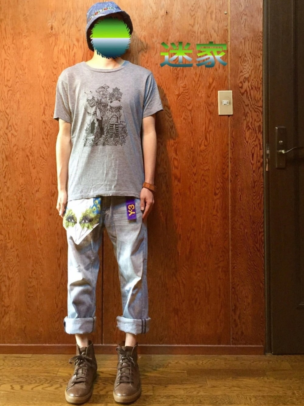 我々が空想で描いて見る世界より、 隠れた現実の方がはるかに物深い。 by柳田國男 私達、絶賛放送中アニメ 「迷家〜マヨイガ〜」 にはまっています(^^) 人生に迷い疲れた若者達が、社会をドロップアウトした行方不明者が集まって生活しているという噂の地図にない村「納鳴村」を訪れ、そこで不思議な出来事に遭遇しまくるという話。 展開はほぼ出尽くした感の村系都市伝説と映画「スフィア」的な展開(今のとこ)なんですが、 ベースになっているのが、東北地方に残る伝承や逸話、怪異などをまとめた名著「遠野物語」なんですね〜(^^) 都市伝説大好きっこの私達は久しぶりに遠野物語にどっぷりハマっています。 梅雨入り間近のジメジメとした季節。 地図から消えた村 杉沢村とか 降りてはいけない駅 きさらぎ駅とか 異界、妖怪、都市伝説、風習、 廃墟、廃村、暗い森、トンネル、 エレベーター、公衆電話、 無人のドライブイン、 シャンプーしてる時の頭上、 などなどが気になる季節になりましたね(^^;; 火のないところに煙はたたぬ! 河童も座敷童子もきっといる! できれば座敷童子は広瀬すずのようなんがいい!! 添い寝されたい!ちはやふる! が、合言葉の師匠の今回のコーデは 八つ墓村を訪れた金田一耕助の様なバケットハット(^^) 師匠、坊主でバケハブカブカです。 人語を操るオサレなカエルとカタツムリが織り成すノイエルの森での物語。 「ワンダーフロッグ」のTシャツ。 あやかしか、まやかしか、 ダメージデニムに見せかけ、 実は転写プリントなLEEのパンツに、 クジャクの羽根的なものに目が生えてこっちを見ている、女王蜂のスカーフを垂らしています(^^;; スニーカーはスピリチャルからの、ネイティヴな刺繍のあるマークのレザースニーカーです(≧∇≦) ちょっぴり不思議な異界コーデの師匠は遠野物語からの都市伝説ネタの掘り下げに夢中です(^^;; そして、、、、、、、、、、深夜。 廊下を何度かドタドタドタドタドタドタ という音が駆け抜けます(O_O) 怖いなぁ〜変だな〜怖いなぁ〜変だな〜 怖がりの師匠が、1人でトイレに行く時チキンすぎて、全速力です(O_O) 散らしてたら、お化けにしてやろうと思います(^^)