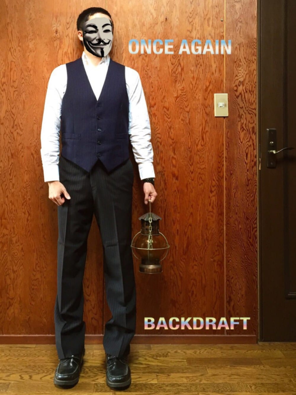 風はまた吹く 気付かないかざしな!人差し指を! 陽はまた昇るゆっくりと 決して立てるな!己にその中指を! 風はまた吹く その時立てろ親指を!!! 「ONCE AGAIN」 by ライムスター ということで、WEAR界のマミーD(髪型から)ことタミフル氏、主催のバッグドラフトに、、、、 WEAR界の宇多丸こと、、、、 師匠と私、パスト代理人 (坊主で映画好き以外の共通点なし、てゆうか宇多丸はスキンヘッド、調子のってさーせん) が!! 再戦させていただきます!! WACKなコーデでセルアウトするぜ!! 師匠の失笑コーデはマジ自重!! タンメンでも食べてろ!! 次長課長! なんて、言わないでくださいね(^^;; インパクトは前々回コーデのTサツ以上の主張を持ち合わせていないので割愛すます(^^) お題目① 「意外性」 と、いうことで、、、、、、 日頃の引きこもりスタイルとはちょっと正反対のシャツとジレのかっちりスタイルに師匠、挑戦しました(^^) 坊主にスーツという、本文冒頭に登場する「ONCEAGAIN」という名曲のPVにでてくるライムスター宇多丸氏の雰囲気を師匠が頑張った結果!!! 見事にタクシーの運転手さんの雰囲気が出てきましたねwwww 師匠、本人はこれ!あれじゃね? 明智小五郎みたいじゃね?? とWACKなFLOWをかましています(O_O) ジレは古着です。 着た瞬間に第一ボタンが飛びました(O_O)もう恒例過ぎる件。 シャツは腕まくりをしていたせいか、袖がシワシワです(O_O) ここはタクシーの運転手さんではなく、事務員さんになっています。 パンツはスーツのズボンの方です。 足元は師匠が持っている数少ないスニーカーでない履きもの。 モンクストラップのエナメルシューズです(^^) たまにはかっちりとしたスタイルで、意外性を出しました!! (たまにスーツスタイルしてるじゃんというツッコミは黙殺します。) お題目② 「サムズアップ」 師匠の右手をご覧ください。 申し訳なさそうに親指立ててますww 師匠曰く、猿岩石と双璧をなすヒッチハイカーの僕が本気で親指を立てると、家に車が突っ込んでくるからだそうです(O_O) 変なとこを変な言い訳で照れ隠しをすることに対して、私はdisさえ思い浮かびませんでした(O_O) そんなこんなでバッグドラフト参加させていただきます(≧∇≦) ええ、ええ、 色々とコーデも文も大味ですよ(O_O) さーせん!!!