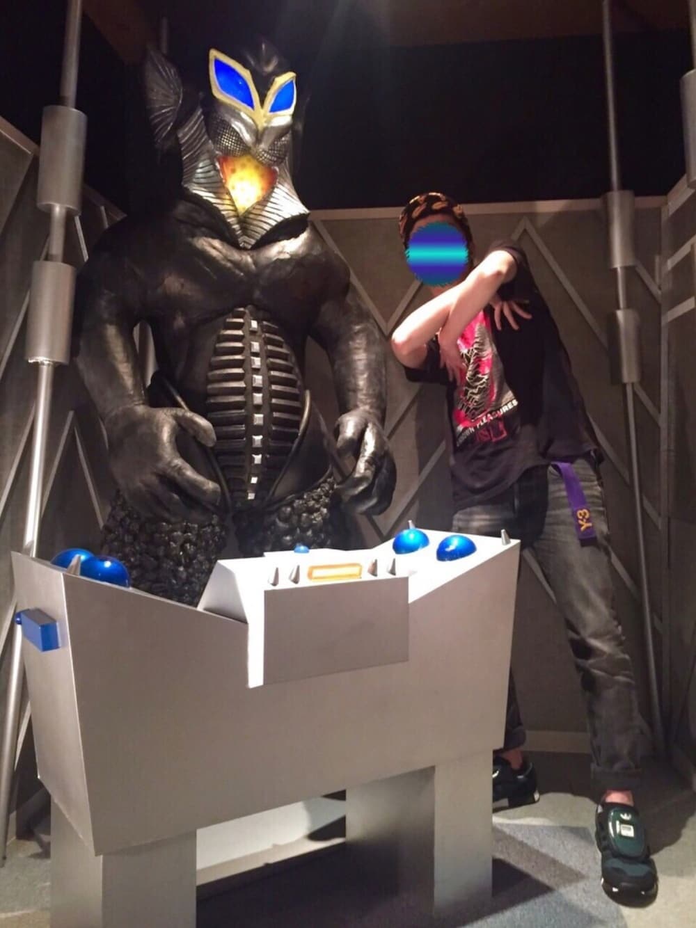 謝罪します。 この度は師匠はついに己の欲望に負け。 売り飛ばしました。 地球を、、、、、、、、、、、 そう、そこにはヒーローはいない。 とある酒場、、、、、、 薄暗い中、所狭しと異形なる容姿と確固たる暴虐性を持ったモノ達が集いし酒場。 とあるテーブルに私達は腰を据えて店内を見渡していた。 そこに現われし、黒き存在は私達に語りかける。 「君のTシャツには約2300光年離れた星の中性子性のパルサーが描かれている。君はパルサーが発する電波及びX線がどれだけ惑星航行において影響を与えていると考えているのかな?」 黒き存在はそう私達に投げかけてくる。 私達は宇宙に出たことのない人間である。 わかるはずもない。 しかし師匠はとっさに自分が考えた理論を黒き存在へと返答する。 すると黒き存在は、 「ふむ、やはりデキる子だ。 私はね自分の星からずっと師匠と地球を見ていて、とても欲しくなったんだよ。 そこでだ地球と私達の星々で暮らす権利を交換しないか? 力づくで地球を奪うことはあまりしたくない。 たった一言、地球をさしあげますと言ってくれないか? 宇宙は無限に広くしかも素晴らしい。 地球のように戦争もなく、何百年何千年と生きていける天国のような星がいくつもある。 プリテーなエイリアン美女もいる。」 師匠は「プリテーなエイリアン美女」と黒き存在が言った瞬間、食い気味に 「地球あげます!!」 と宣言しました。 人類よ、すまぬ。 地球は黒き存在ことメフィラス星人に征服されることになりそうです。 ごめんなさい。 と!(O_O) グダグダ前置き失礼しましたっ!! 私達、一度は行ってみたい!! ウルトラマン、ウルトラ怪獣好きの聖地、「怪獣酒場」に行ってきました!! だってウルトラマン好きなんだもの。 だってウルトラ怪獣好きなんだもの。 ぱすと。 ねこニココンビが合流するという噂を聞きつけ!合流するなら怪獣酒場行こう!と懇願しました(≧∇≦) 本当に私達の趣味に付き合わせてしまう形で申し訳!(≧∇≦) いやはや!マジウルトラ楽しい場所でした(^^) ウルトラマンやウルトラ警備隊は入店できない、怪獣や星人達の店!! 所狭しと怪獣が沢山! メニューも怪獣にちなんだものばかり! おぉ!おぉーー!!とイチイチ歓喜の声が鳴り響くのでした。 そんな師匠のコーデは ウルトラQに出てくる人工生命M1号の大好物で、よく走るケムール人を滑らせるバナナの柄のキャップ(^^) バルタン星人やヒッポリト星人などがいるであろう惑星間の中性子性のパルサーのグラフィックのジョイデビジョンTシャツ(^^) スニーカーは海底原人ラゴンや吸血植物ケロニア、グリーンモンスカラーのadidasです(^^) 師匠の隣にいらっしゃるのは 知能指数(IQ)1万越え!(O_O) の悪質宇宙人メフィラス星人です。 地球人に地球あげますと言わせて、地球を征服しようとする非暴力のインテリ宇宙人です(^^) 師匠はこのメフィラス星人と共に地球征服にのりだすと言っています(O_O) そんな師匠のIQは、、、、、、 シュワッチ!!!!!!!!!!!