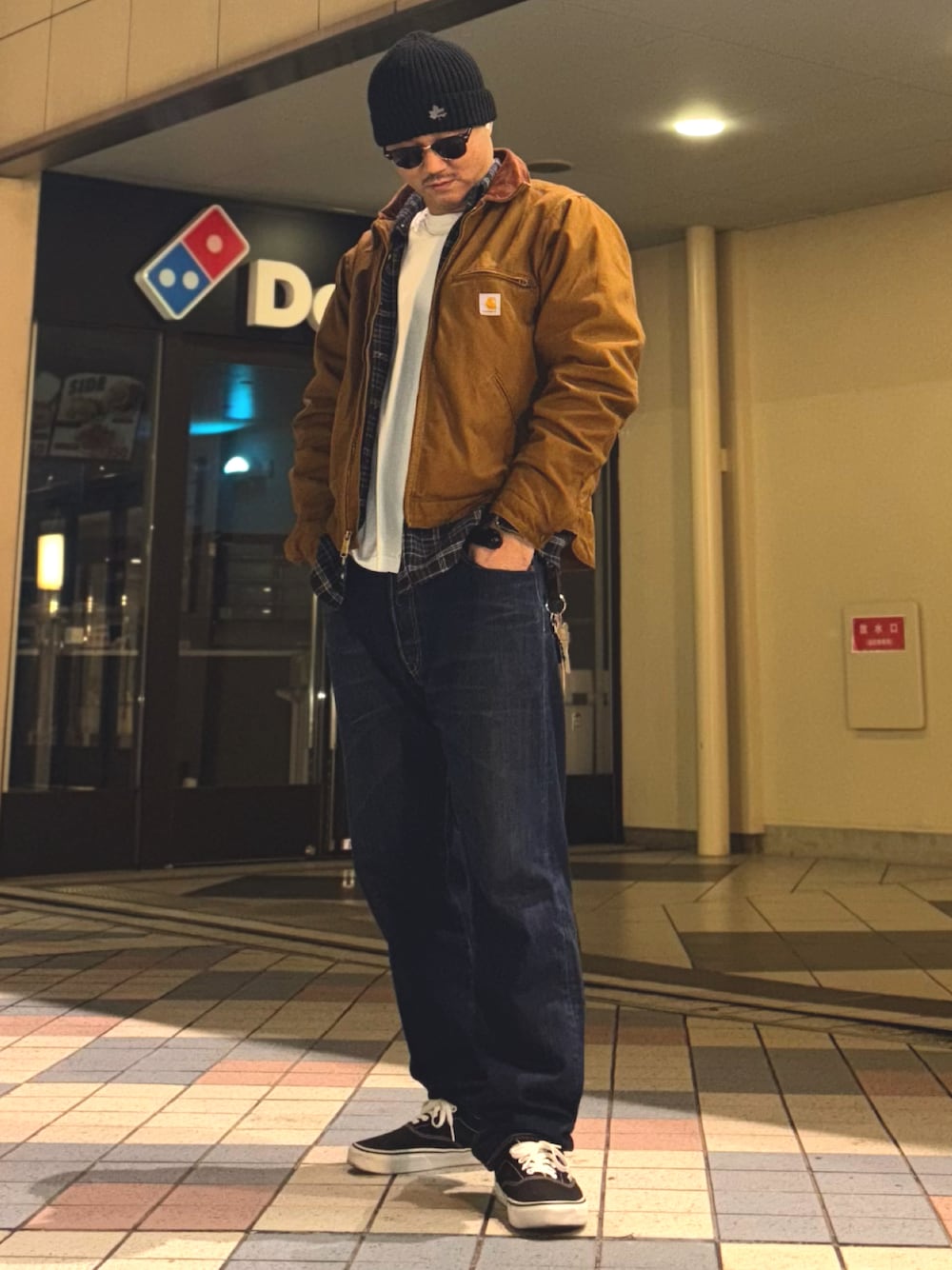 最近ヘビロテのCarharttデトロイトジャケットです🤗みなさんしばらくお付き合いください🙇 LOGOS ビーニー Carharttデトロイトジャケット パレット ネルシャツ Levi's501 VANS エラ あと、ところてんの味は酢醤油も黒蜜もどっちも苦手です🤮