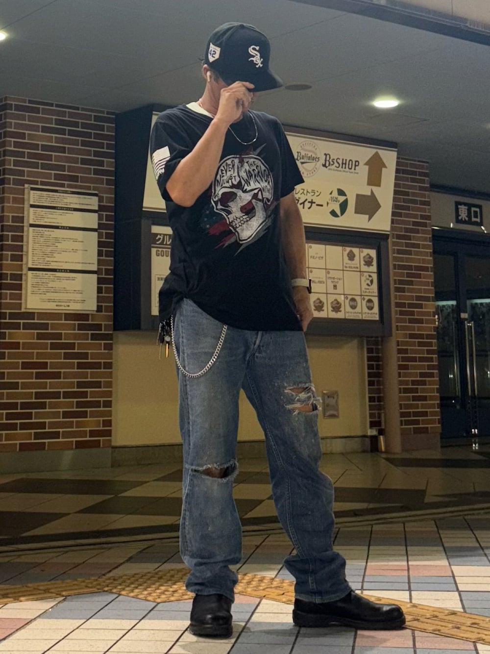 今日のNEW ERAは59FIFTY Jackie Robinson Day 2024シカゴ・ホワイトソックスです🧢 NINE LINE APPARELのTシャツの面がいいなぁと思い古着で購入しましたが、ミリタリー系のブランドでしたね💣 プリントがスカルなんでロックっぽいコーデにしました🎸 グランジファッションに寄せてダメージデニムをチョイス🕶️ まぁ、ロックな感じもいいなぁと思いました✌️ あと、スマホのガラスフィルムはいつも2日くらいで割れます😅