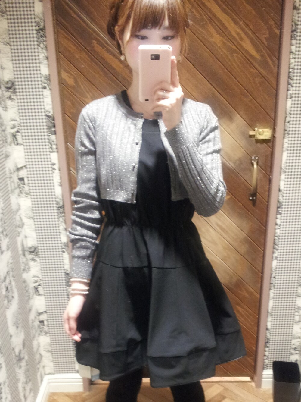 ブラック系のワンピースを着用したレディースの春コーディネートの1枚目の写真