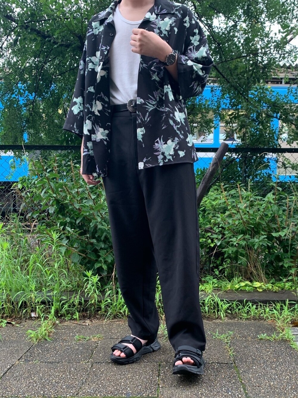 夏にはラフな柄シャツを🌞🌴🌺✨ あまり重くなりすぎるのを避けるためにサンダルで少し抜け感を出しました🙌