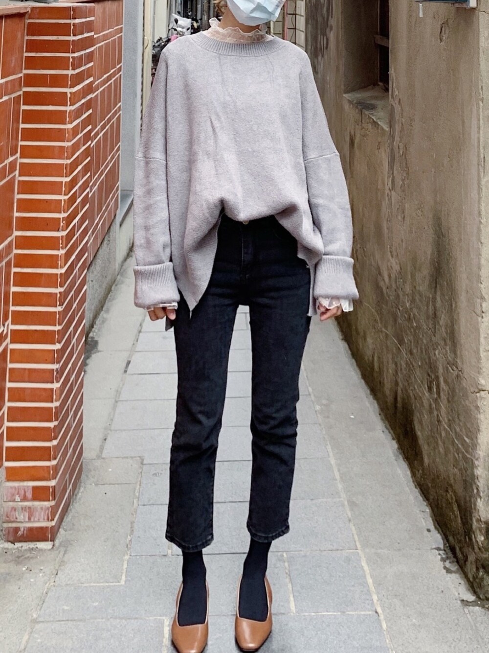 莫蘭迪色的寬版毛衣,內搭蕾絲內襯,簡單也溫柔~🥰