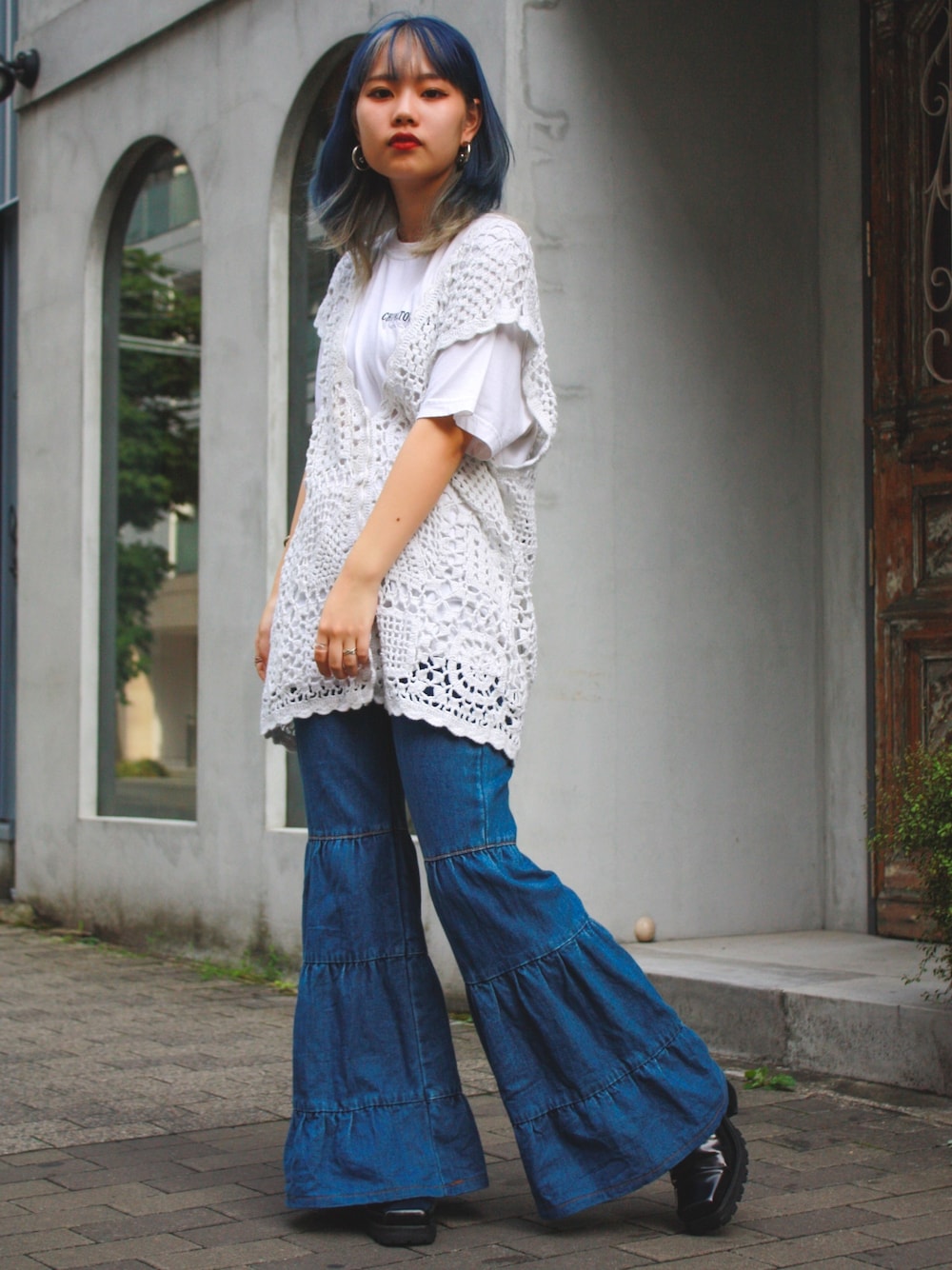 クロッシェのベストとデニムのフレアパンツ
