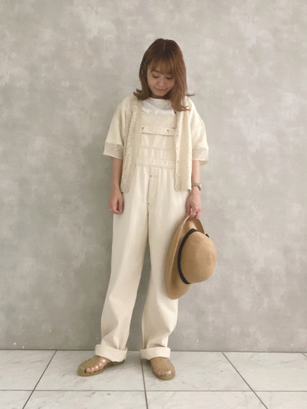 いつもご覧いただきありがとうございます♩ オーバーオールを使ったホワイトコーデ🤍 まだまだお昼時は暑いので、日差し避けにブルトンハットをプラスしてみました𓍯 instagramも毎日更新しております✨ @pdd.tennojimio 是非ご覧くださいませ!