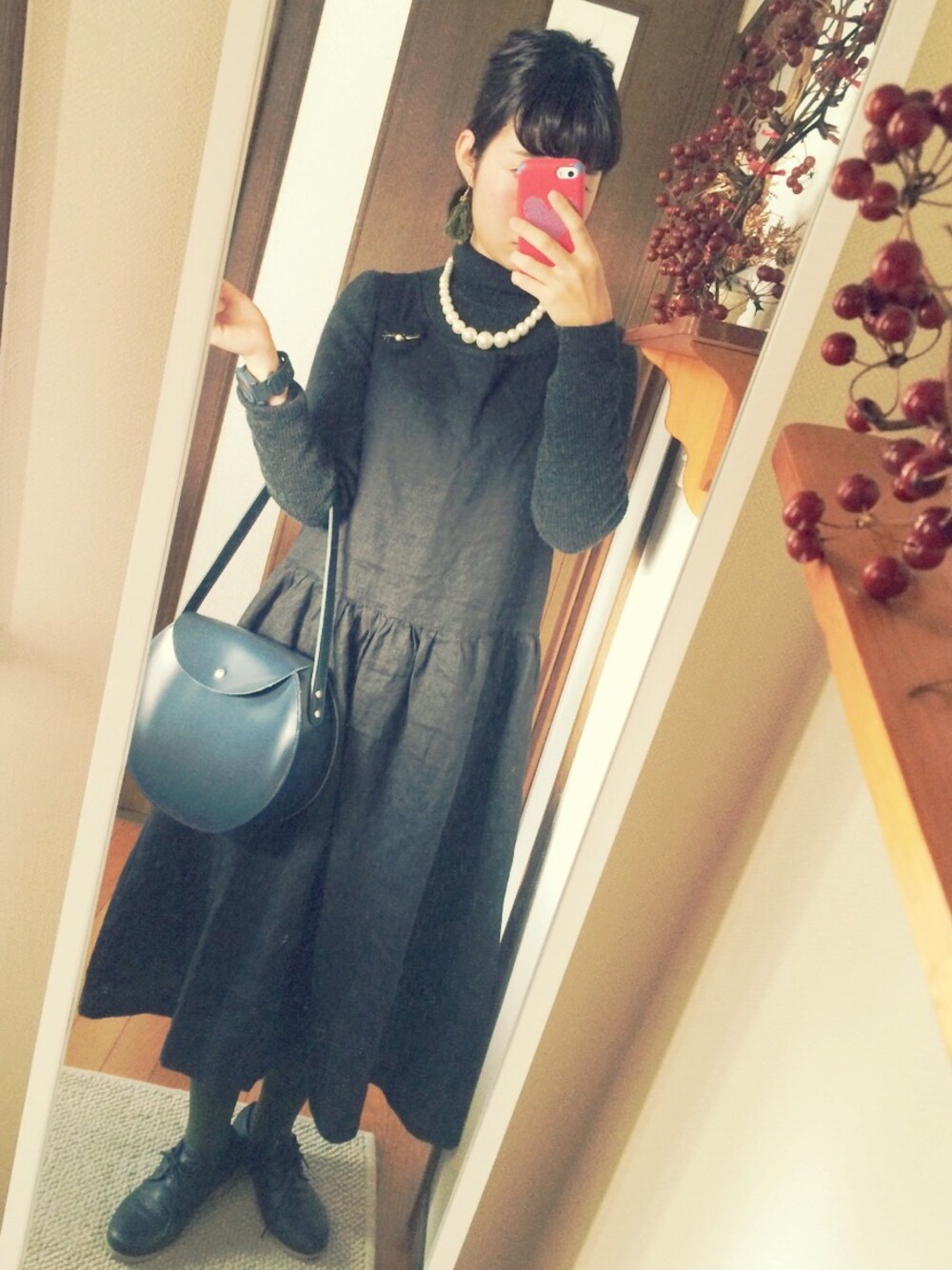 ダークトーンに、 ピアスとタイツをカーキにして 差し色にしました〜〜 ピアスは、職場の方が つくってくださったもの! お気に入りです!