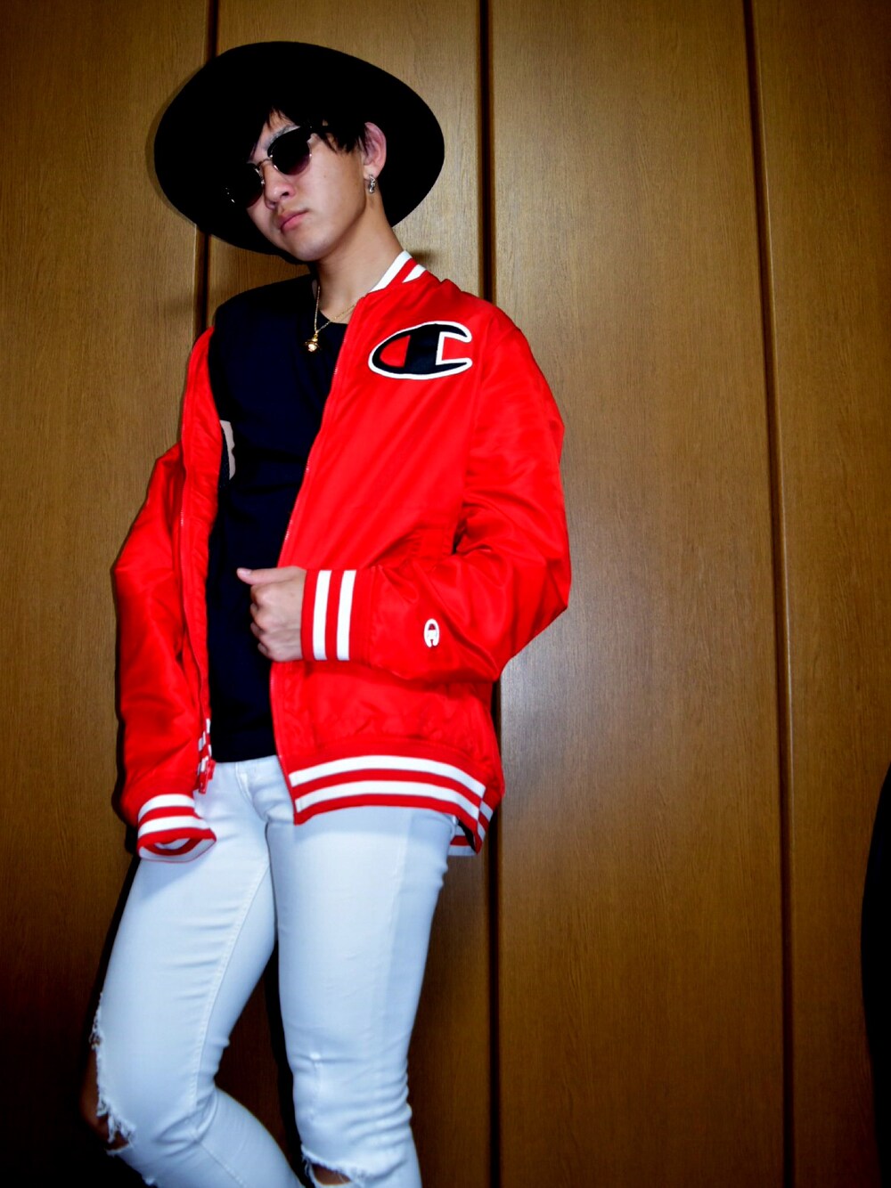 久々投稿〜😎いつもいいね、save、コメントありがとうございます🙇🏻 今日のコーデの特徴は古着屋で買ったchampionのジャケットで結構目立つRED👚胸のあたりに大きくロゴが入ってるのと腕の所にもロゴが入ってるのがPoint👏🏻✨ そして今回は今までのコーディネートにはなかったのでハットを被ってみました🎩