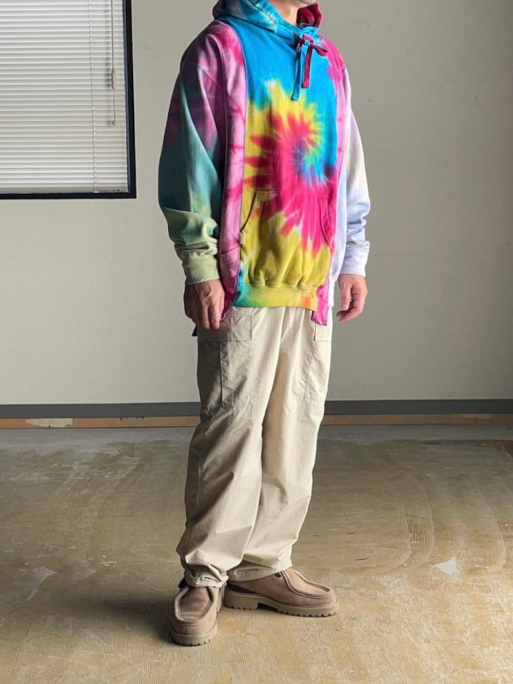 存在感がありすぎるリビルドバイニードルズのタイダイパーカーをメインに他はワントーンで、シンプルに。 上にコートを羽織っても◎ TOPS : M BOTTOMS : S SHOES : 41