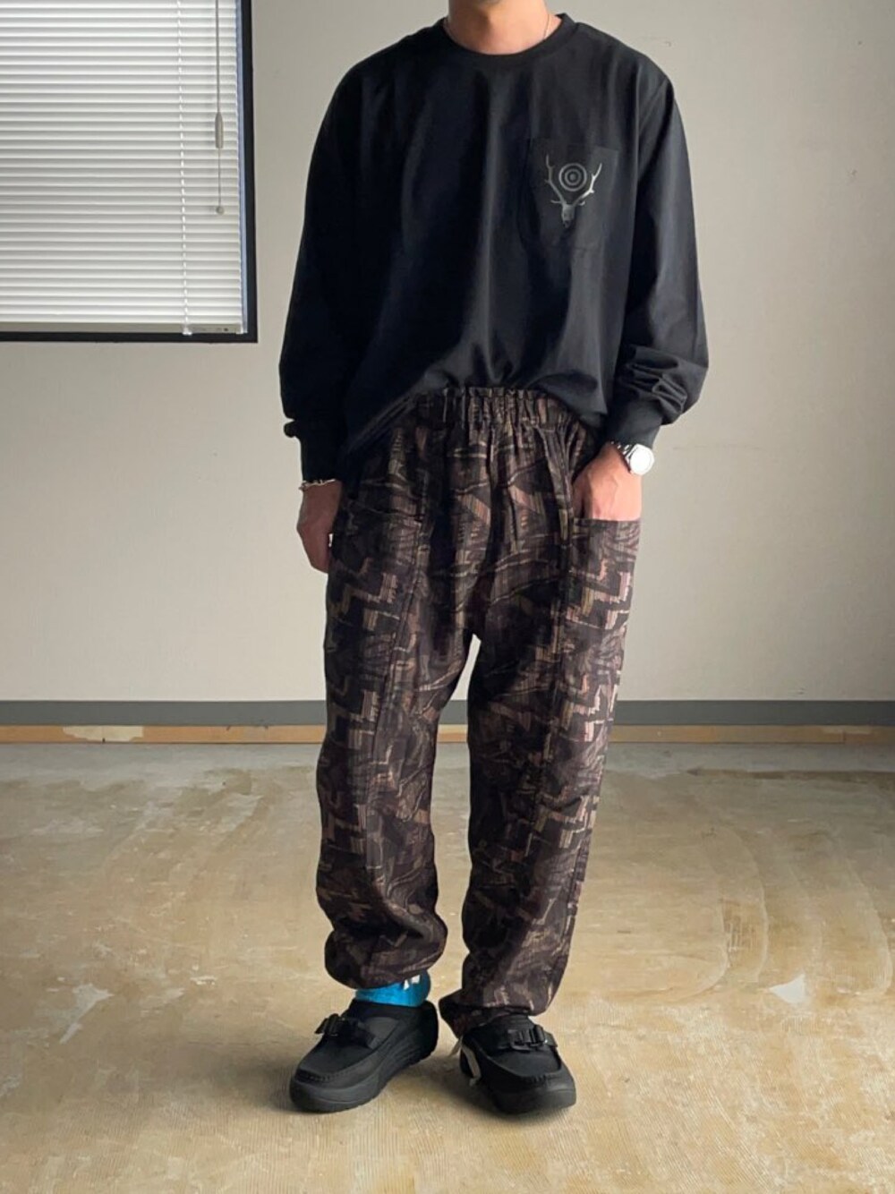 ネイティブ柄をブラックのワントーンで。 ソックスのブルーもポイント。 やっぱり黒はグッと締まりますね。 TOPS : S BOTTOMS : XS SHOES : 26cm