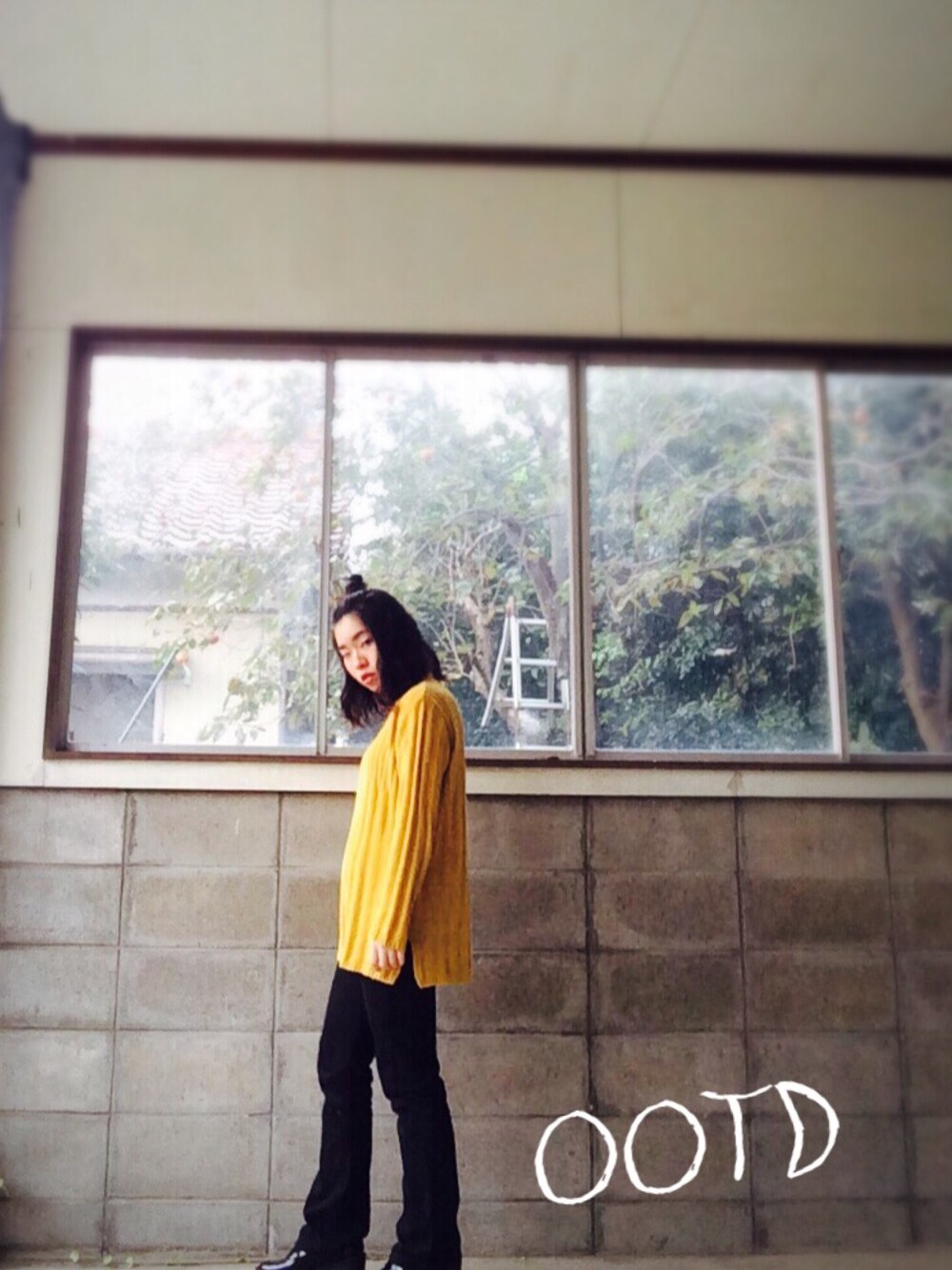 カラシカラーですね。なおかつシンプルでご提供させて頂きました。 トップスはアクリル100%のコーデュロイっぽい起毛素材であったかたか♨️丈も長め。 下はブーツカットのパンツにしてみました☝️