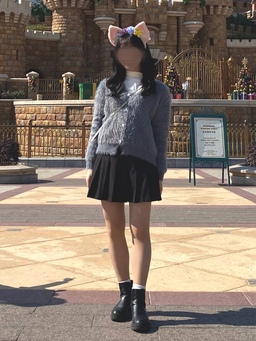 グレー系のカーディガン/ボレロ、ブラック系のスカート、ブラック系のブーツを着用したレディースの春コーディネートの1枚目の写真