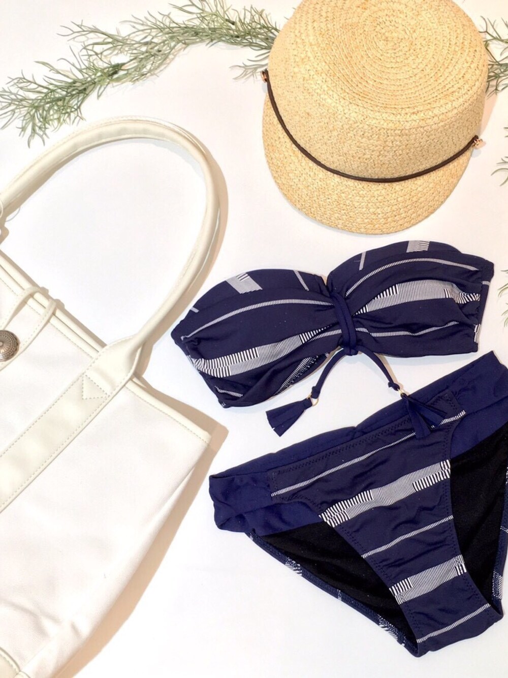 オトナリゾートにオススメのジャガード織りのバンドゥビキニとビーチにオススメのトートバッグ