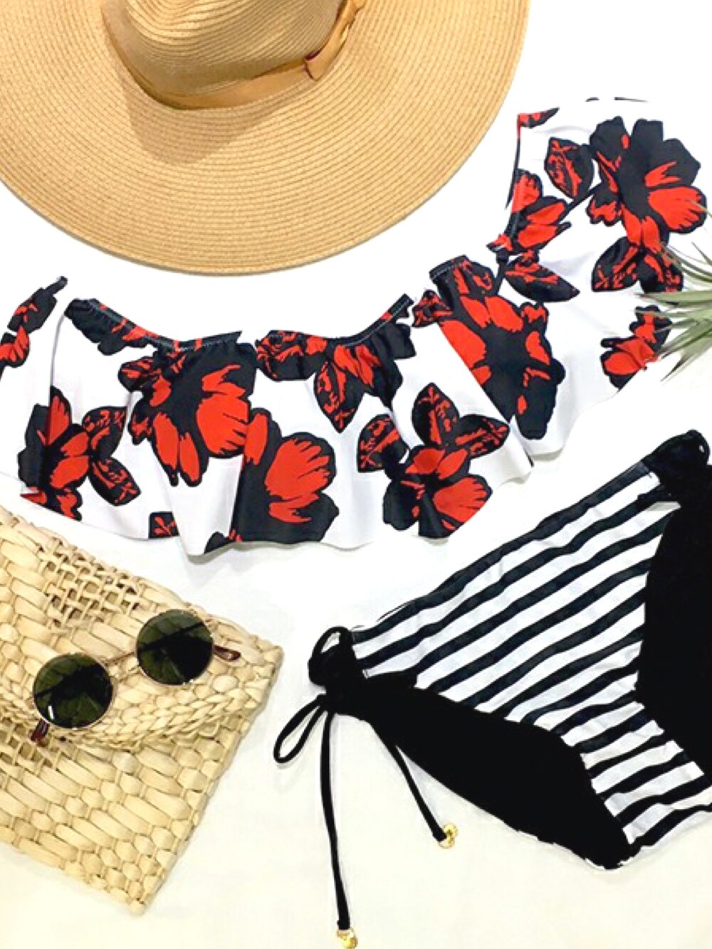 PEAK&PINEプレスの水着「Riberce|花柄オフショルダー×ボーダー・無地リバーシブルビキニ水着【9M/11Lサイズ】」を使ったコーディネート