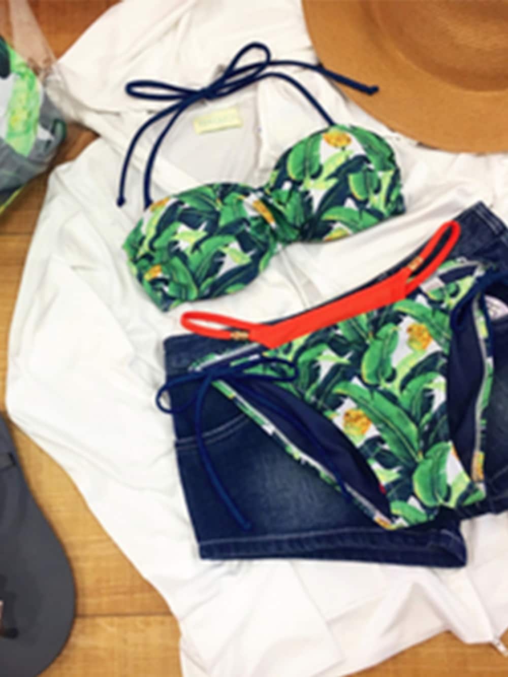 トロピカルなリーフ柄ビキニとショート丈デニムでアクティブに! お水OKのデニムショートパンツなのでこのままプールに入ってもOK!