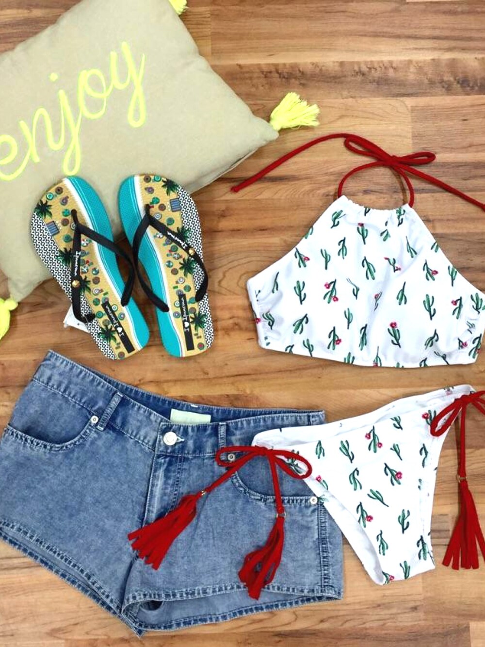 サボテン柄とのハイネックビキニがトレンド感満載! ビーチコーデ
