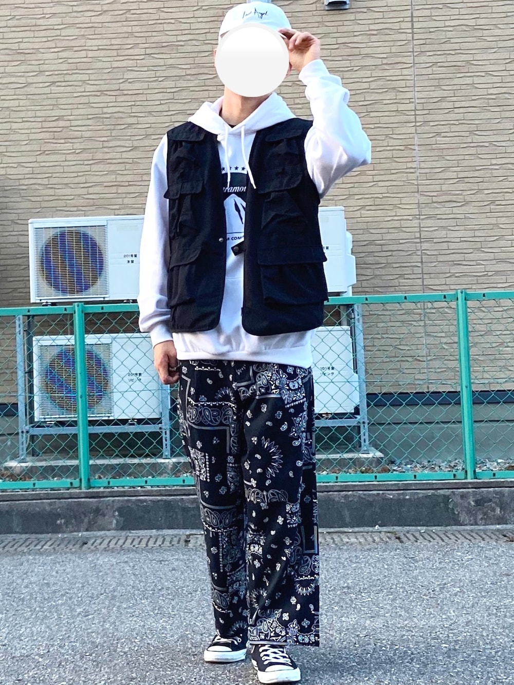 ペイズリーパンツコーデ! ペイズリーのパンツに白のパーカーをチョイスしました!ペイズリーのパンツはかなり印象が強いので極力シンプルなものを選び、 そして黒の面積を増やすためにフィッシングベストを羽織りました!