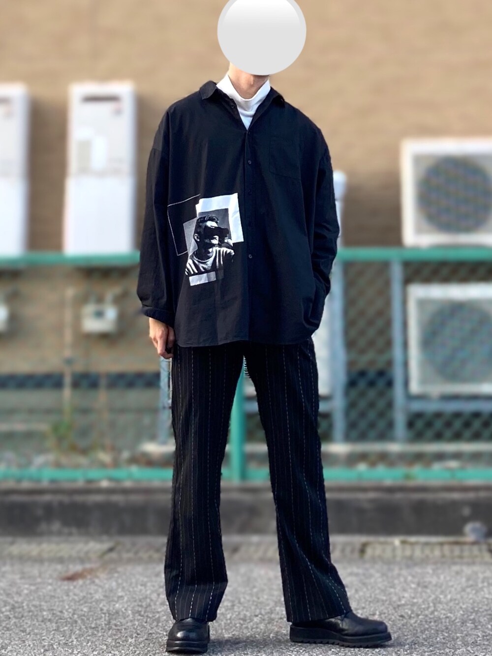 オールブラックコーデ! モックネックのTシャツの上に黒のシャツを着ました! そしてそこでモード感のあるストライプのフレアパンツを合わせて縦長のコーデに仕上げるました!