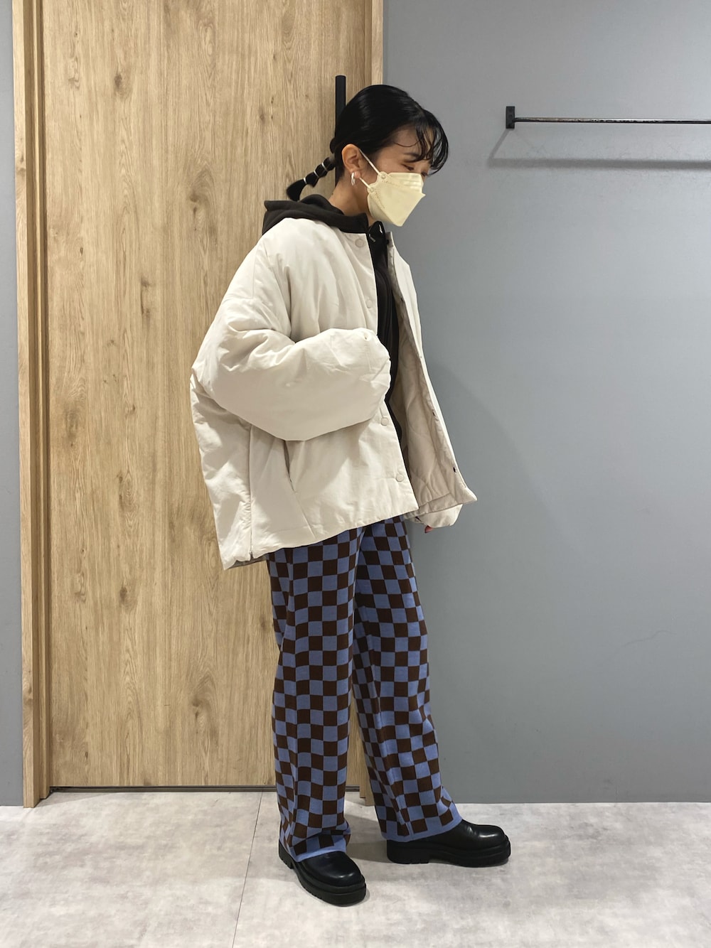 おはようございます☀︎ ご覧頂きありがとうございます🌼 今回のコーデは大人気のサイドファスナーノーカラージャケットを使ったコーデです♡ 特に今着ている白が人気です‼︎ そのアウターに合わせたブロックチェックのニットパンツもゴムで履きやすくて楽チンです♪