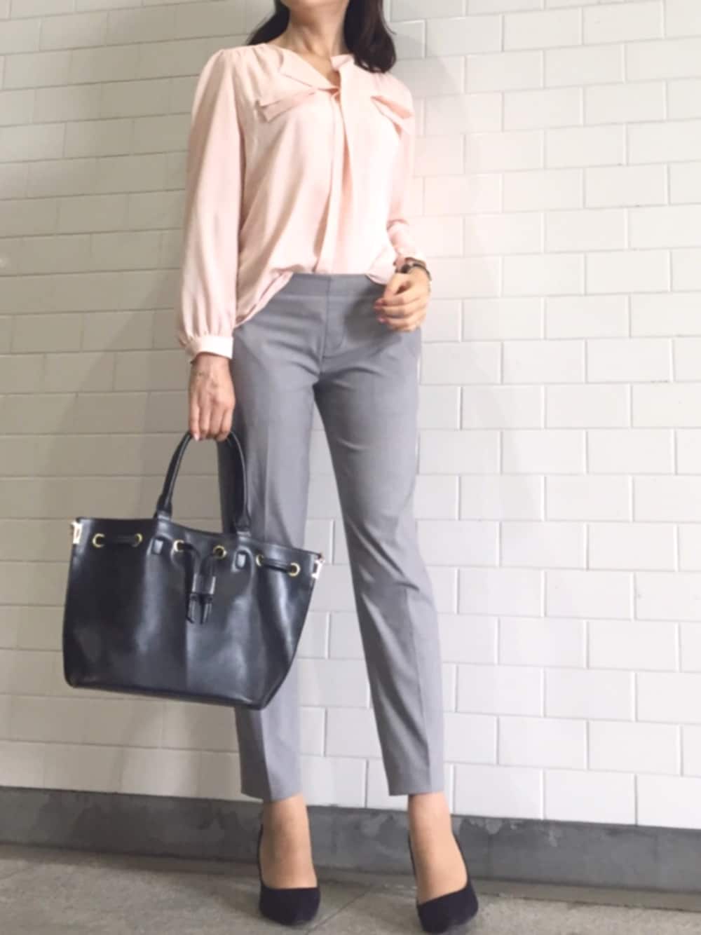 musee.coのとろみブラウスに、ユニクロのアンクルパンツをあわせて、オフィスコーデ。