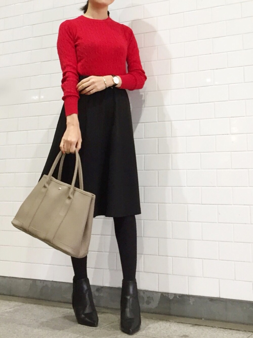オフィスコーデ。 UNIQLOのケーブルニットと黒のスカート。 キツくならないようにベージュバッグを。