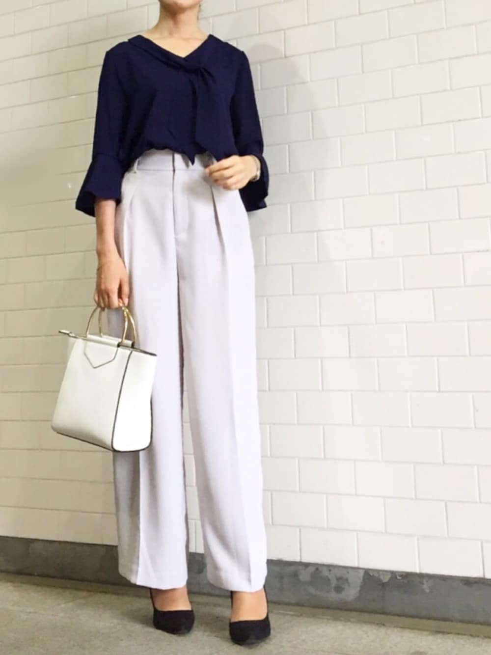 リボンブラウスとワイドパンツでお仕事コーデ。