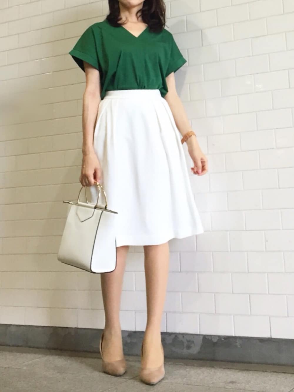 PLSTのトップスはさらりとした着心地。 シンプルにホワイトスカートとあわせて、お仕事コーデ。