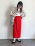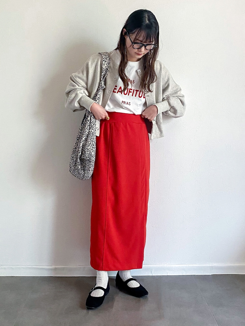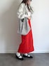 スウェットカーディガンにロゴTにスリットスカート. ぱきっとした赤が可愛い◎