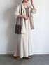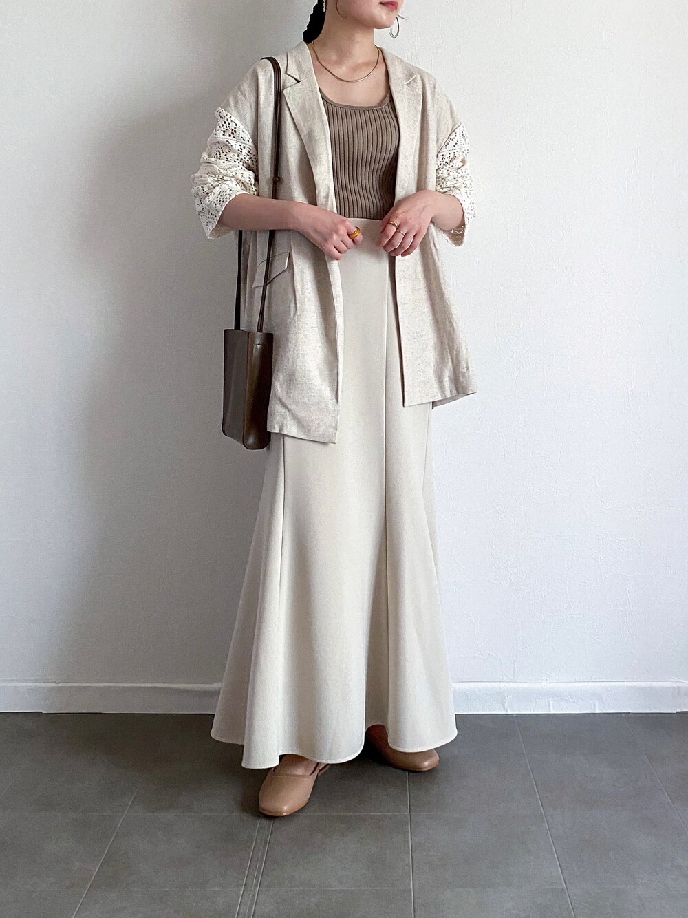 ジャケットにリブタンクトップにマーメイドスカートにベージュのパンプス. clarksのSeren30 Court. ブラックに続きベージュも🧸 優しい色味で淡色コーデに持ってこいのカラーです◎